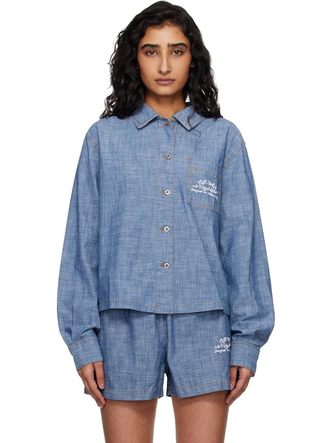 Cotton chambray shirt. · Spread collar · Button closure · Patch pocket at chest · Logo and text printed at chest · Shirttail hem · Buttoned barrel cuffs · Logo patch at back · Contrast stitching in tan Supplier color: Dark blue 100% cotton. Made in Italy 261607F109000