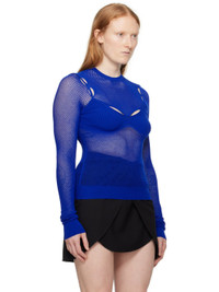 Stretch viscose-blend fishnet T-shirt. Rib knit trim throughout. · Crewneck · Cutouts at chest and shoulders · Bra-style overlay at chest · Jacquard logo at back collar Supplier color: Nautical blue 67% viscose, 28% polyester, 4% polyamide, 1% polyurethane. Made in Italy 241607F110001