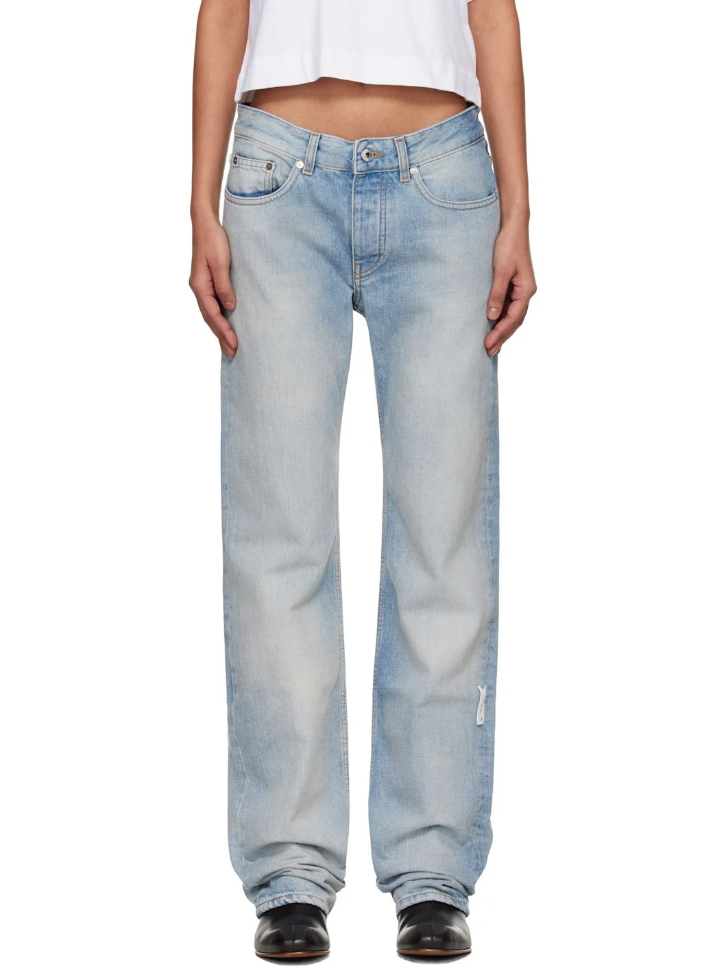 Non-stretch denim jeans. · Fading throughout · Belt loops · Five-pocket styling · Button fly · Logo flag at outseam · Leather logo patch at back waistband · Logo-engraved silver-tone hardware Supplier color: Bleach 100% cotton. Made in Italy 261607F069000
