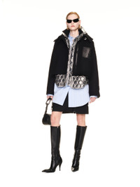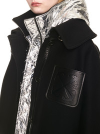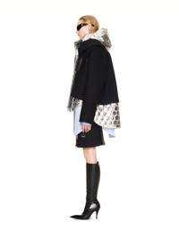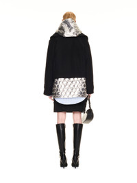 Black padded parka featuring silver details. Tonal flat pockets at front. Silver hoodie. Regular fit. MATERIALS 25% Polyamide 75% Virgin Wool FITTING Model Elisa Nijman wears size 40 Height: 5’ 8" (179 cm) Chest: 32“ (81 cm) Waist: 23” (60 cm)