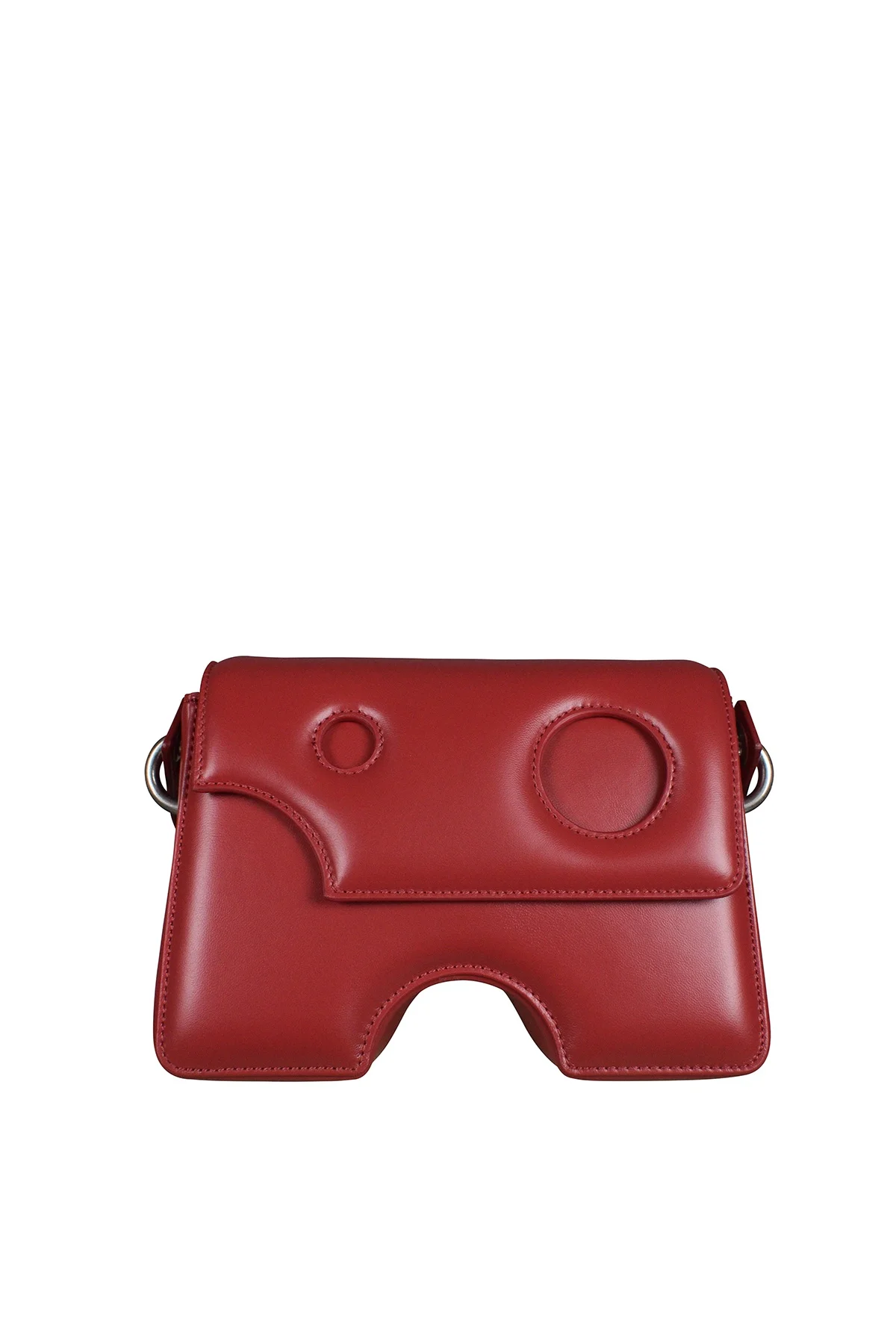 Off-White shoulder bag in smooth calf leather. Burrow 22 model in red color. Iconic cutouts on the whole. Adjustable leather shoulder strap with pin buckle. Silver logo embossing at back. Magnetic snap flap. Interior card slots. Beige and red polished leather lining. Silver hardware. Dimensions: length 22 cm x height 15 cm x width 8 cm. Made in Italy.