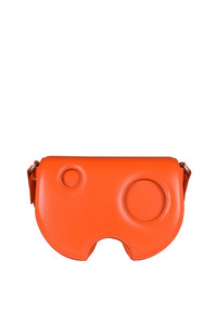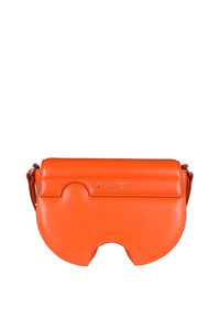 Off-White shoulder bag in smooth calf leather in the shape of a moon. Burrow model in orange color. Iconic cutouts on the whole. Adjustable leather shoulder strap with pin buckle. Gold logo embossing at back. Magnetic snap flap. Interior card slots. Black polished leather lining. Silver finish. Dimensions: length 22 cm x height 15 cm x width 8 cm. Made in Italy.