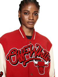 Red varsity jacket with white leather longsleeves. Red and black Off-White and Chicago Bulls patches at front and back. White and black Off-White script at front. Red diagonal details and Chicago bulls patches on the sleeves. Spread collar and elasticized cuffs and hem. Silver buttons as closure. "Off-White™ celebrates Virgil Abloh’s passion for basketball and his hometown by joining forces with the legendary Chicago Bulls. The exclusive capsule collection unites the subversive Off-White™ DNA with the NBA team’s storied legacy. The red-and-cream varsity jacket blends heritage and innovation, balancing a classic Bulls logo on its back with calculated irreverence: the aforementioned scripted words and spirited riffs on familiar emblems, such as a basketball ripping through a net. Part of the proceeds will be donated to the Virgil Abloh Foundation." This capsule is genderless and uses men's sizing. MATERIALS Outer: 26% Nylon Outer: 69% Virgin Wool Lining: 47% Cupro Outer: 5% Cashmere Lining: 53% Viscose FITTING Model Massaer Seck wears size M Height: 6' 1" (185 cm) Chest: 33" (84 cm) Waist: 25" (65 cm)