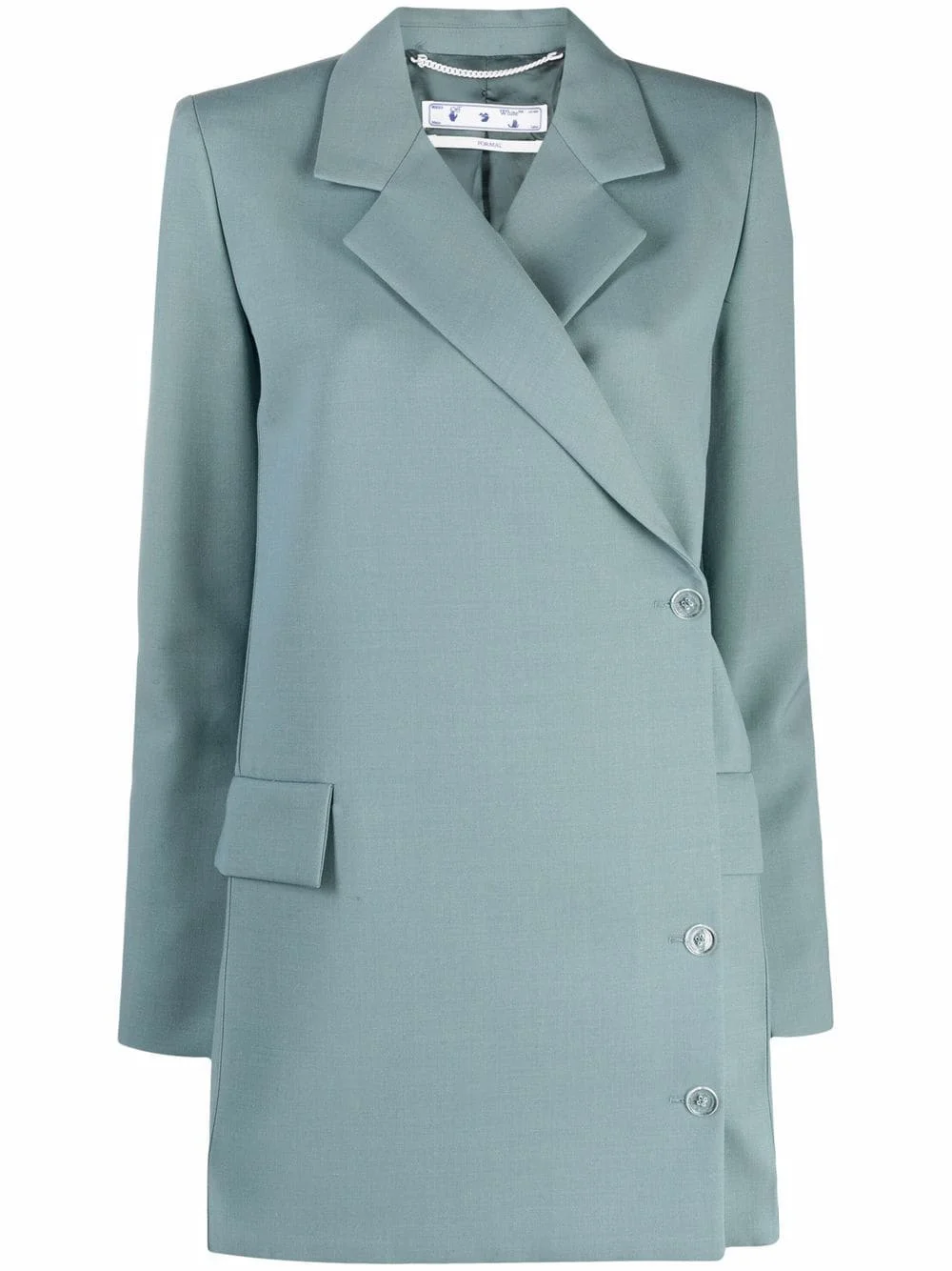 Cardbox wrap blazer A reinvention of the classic double-breasted silhouette, the Cardbox blazer showcases an elongated wrap-style design. Presented as part of Off-White’s AW21 collection, this piece captures the label’s contemporary visual style. Highlights - Blue - Recycled wool blend - Notched lapels - Front button fastening - Long sleeves - Two side flap pockets - American rear vent Made in Italy Composition Outer: Polyester 55%, Virgin Wool 45% Lining: Viscose 52%, Cupro 48% SIZE & FIT Model measurements Height 5 ft 11 in(1.8 m) Bust/Chest 31.49 in(80 cm) Hips 36.61 in(93 cm) Waist 24.4 in(62 cm) FittingInformation This piece fits true to size. We recommend you get your regular size Cut for a loose fit Made with a mid-weight non-stretch fabric