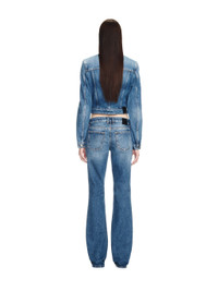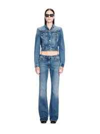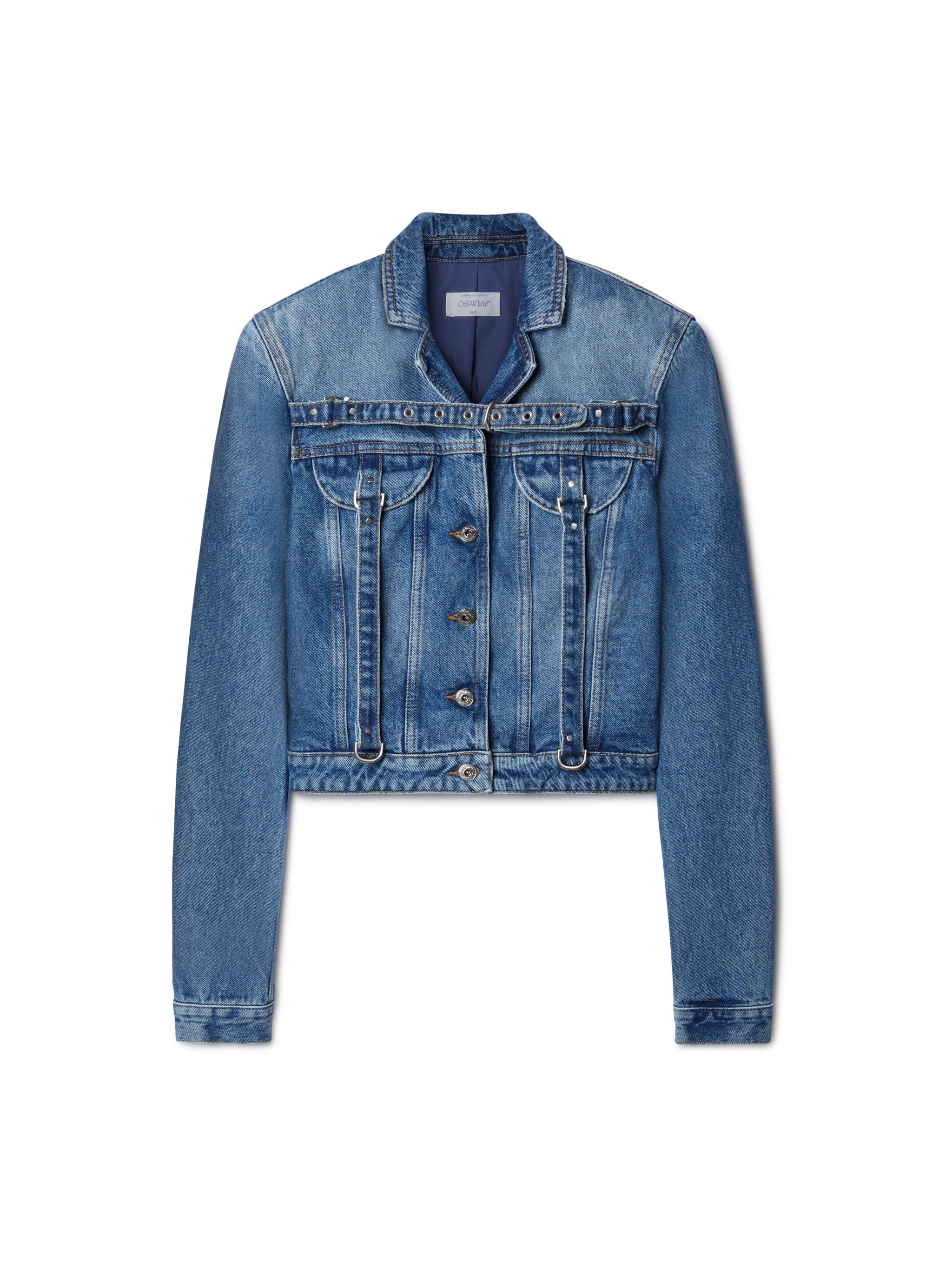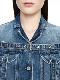 Denim crop jackets with buttons frontal closure.Belts frontal details and two flat pockets at front.Spread collar MATERIALS 100% Cotton FITTING Model Lydia Celesta wears size 42 Height: 5’ 10" (178 cm) Chest: 30” (77 cm) Waist: 23” (58 cm)
