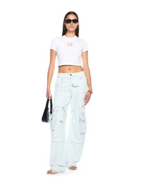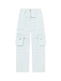 Structured denim pants characterized by innovative cargo design and architectural detailing. - High-rise waist with secure button and zip fastening - Integrated belt with utility aesthetics - Multiple front and side cargo pockets for functionality - Articulated seams enhancing visual depth - Sculptural wide-leg silhouette - Reinforced rear yoke for added structure - Signature logo patch at waistband - Premium cotton fabrication for durability DETAILS - Fabric: 100% Cotton - Code: OWYB01JF25DEN0014300