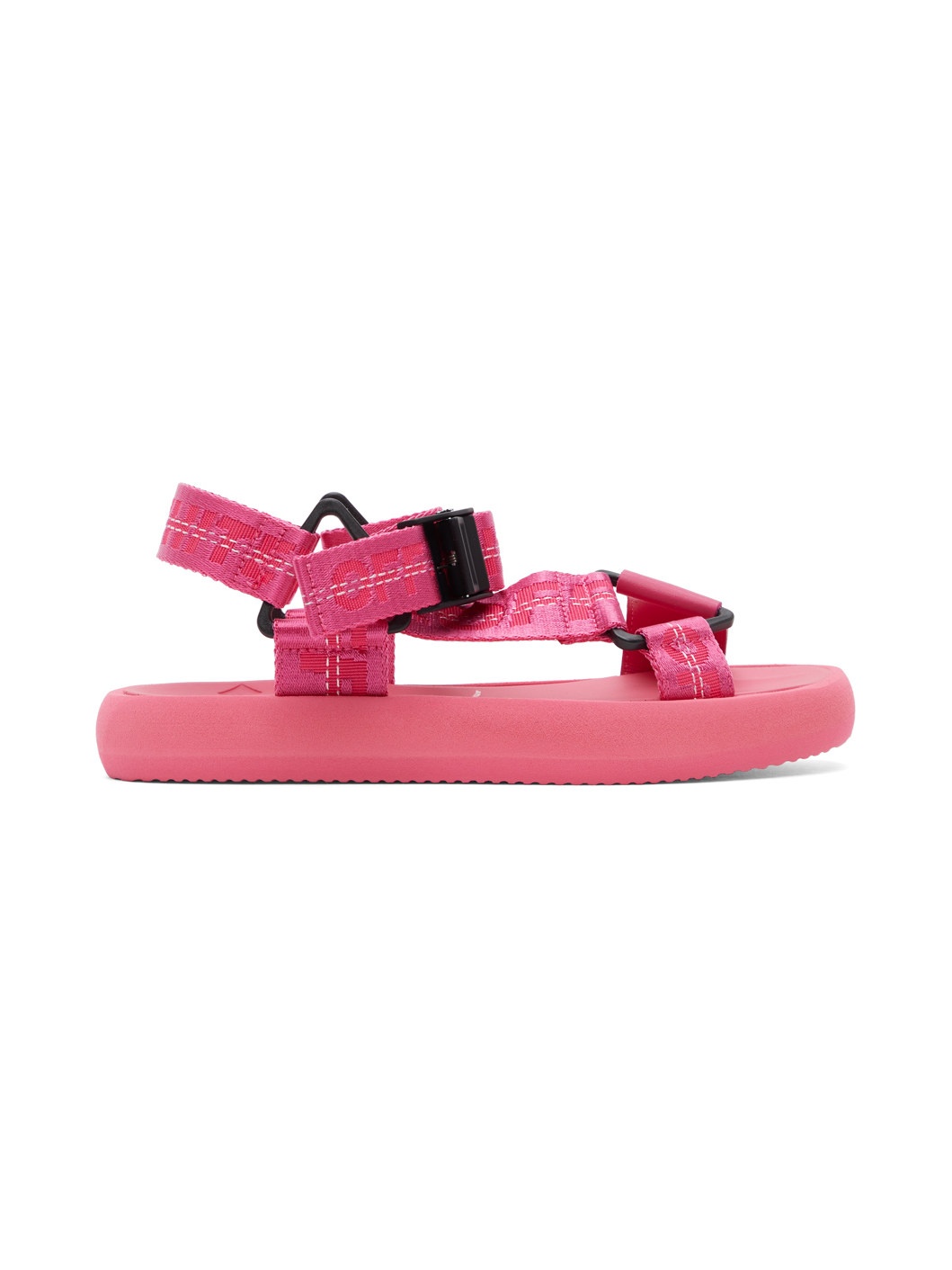 Logo-woven webbing sandals in pink. Open round toe. Tonal buffed leather trim featuring logo printed in white at vamp. Adjustable ankle strap with cinch fastening. Logo embossed at tonal molded rubber footbed. Tonal treaded rubber sole. Logo-engraved black hardware. Supplier color: Pink Upper: textile, leather. Sole: rubber.