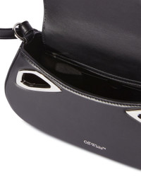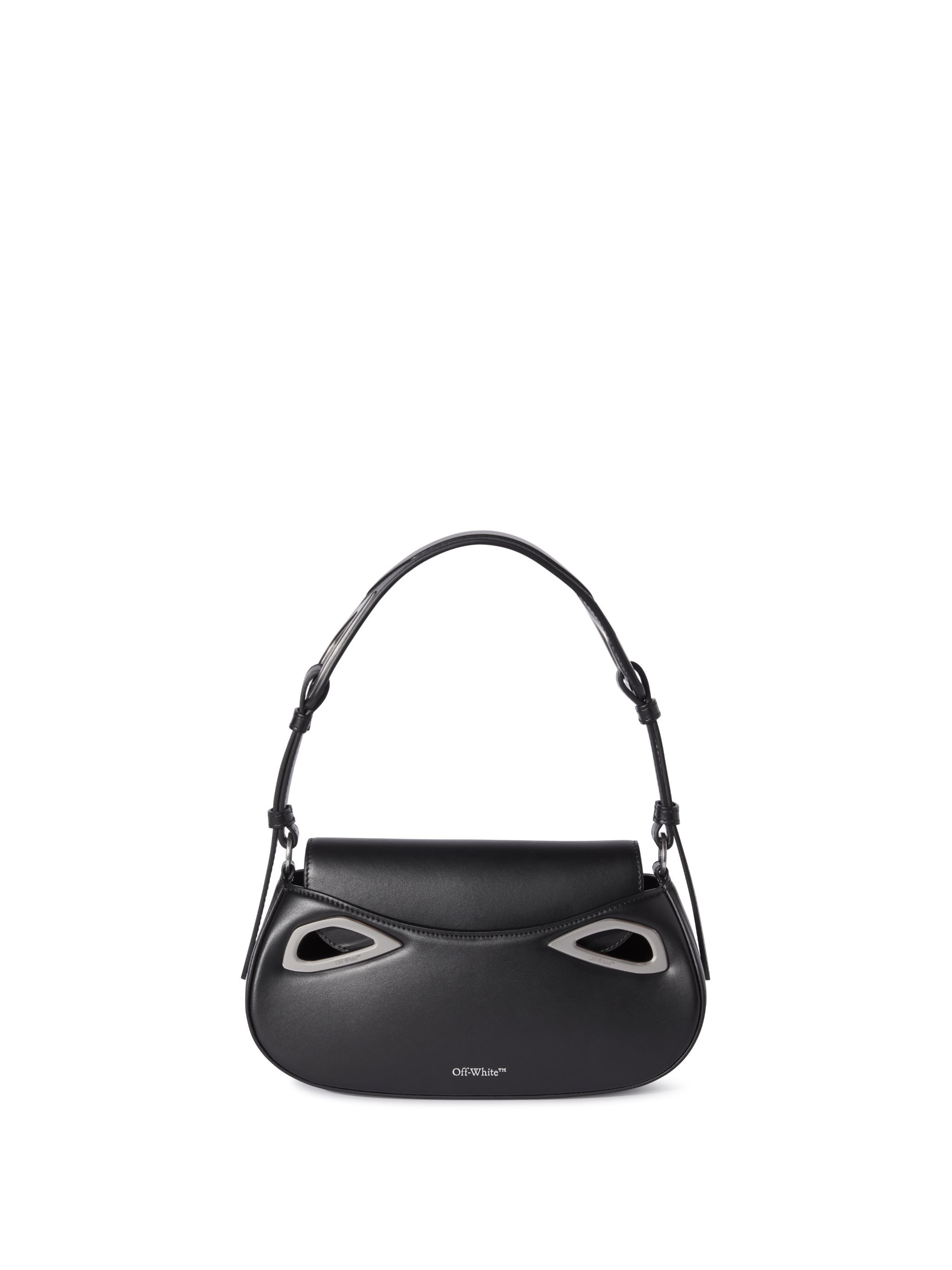 Black shoulder bag featuring white Off-White logo at front. Silver details. Tonal shoulder strap. MATERIALS Lining: 5% Acrylic Outer: 100% Calf Leather Lining: 95% Cotton FITTING Bust 0cm Height 0cm Hips 0cm Waist 0cm