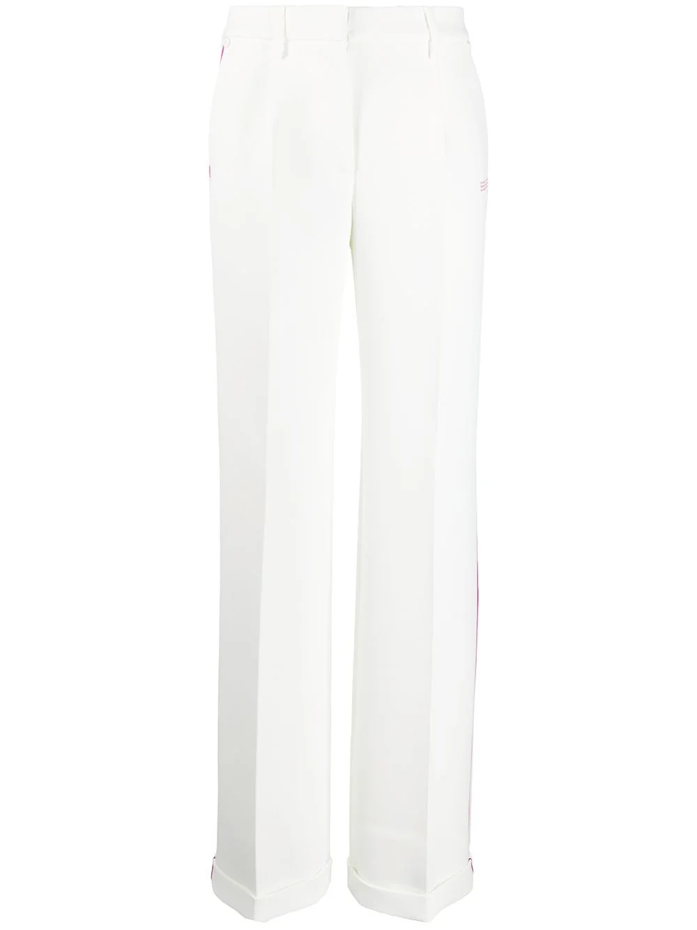 contrasting trim tailored trousers Well, well, well. If it isn't Miss "I only wear jeans" lusting over these contrasting trim tailored trousers once again. That's why you should never say never - especially with Off-White around. Featuring a tailored design, a contrast piped trim, a straight leg, a waistband with belt loops, rear welt pockets and side slit pockets. Made in Italy Composition Outer: Polyester 100% Lining: Polyester 100% SIZE & FIT Model measurements Height 5 ft 10 in(1.79 m) Bust/Chest 32.67 in(83 cm) Hips 35.43 in(90 cm) Waist 25.98 in(66 cm) FittingInformation This piece fits true to size. We recommend you get your regular size Designed to be fitted at the waist and hips, loose over the leg Made with a mid-weight non-stretch fabric Washing instructions Dry Clean Only