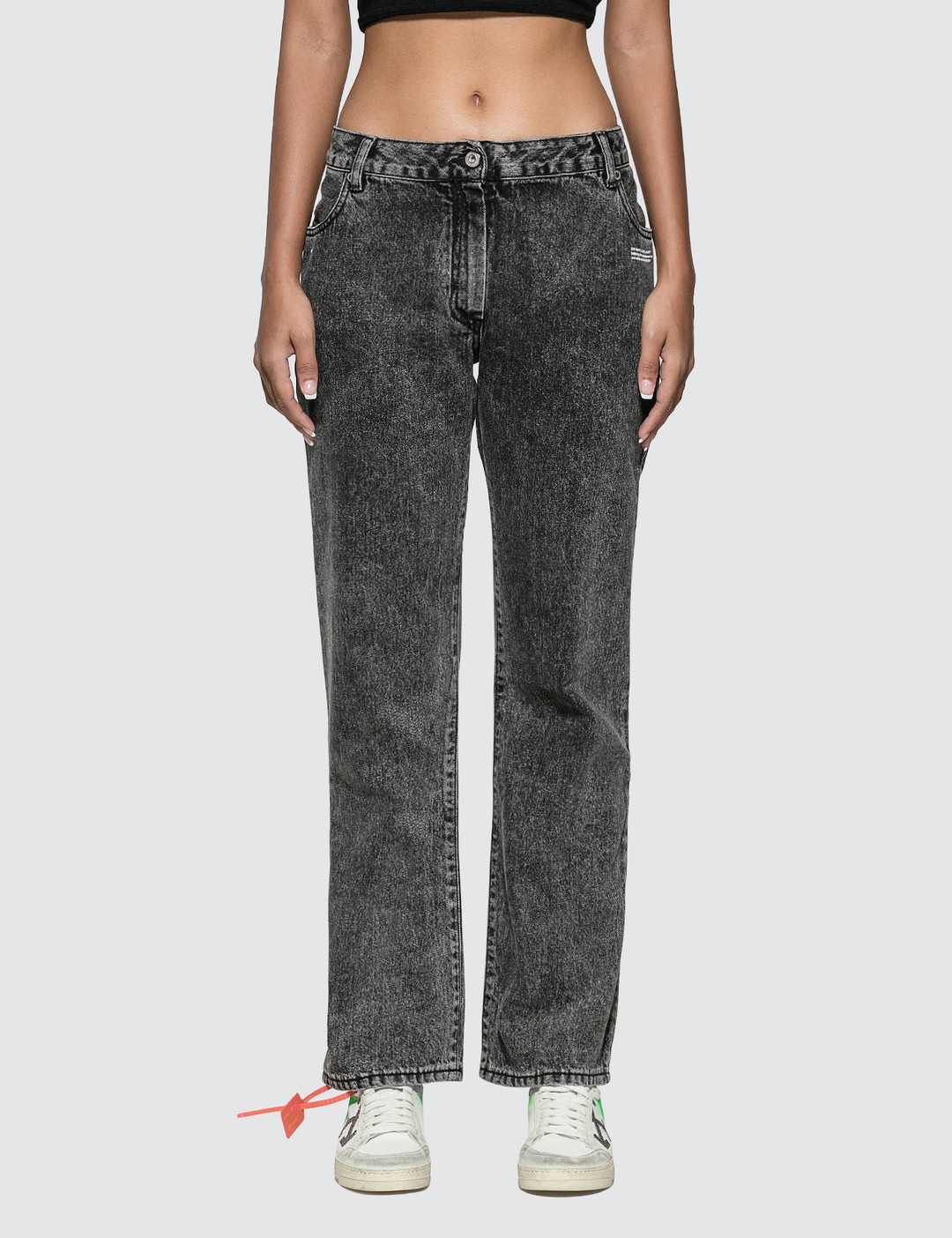 - Off-White - Slightly Bell Jeans With Twisted Scarf - Mid rise - Straight cut - 4 pockets style - Logo patch at the back - Belt loops with a twisted scarf - Color: Dark Grey - 100% Cotton - Made in Italy SIZING Scarf Approximate dimensions: - Fits true to size, take your normal size - Designed to be worn fitted - Model wears size 26 - Model measures: Height 177cm, Chest 31”/80cm, Waist 24”/61cm, Hip 35”/88cm - 48 X 48cm