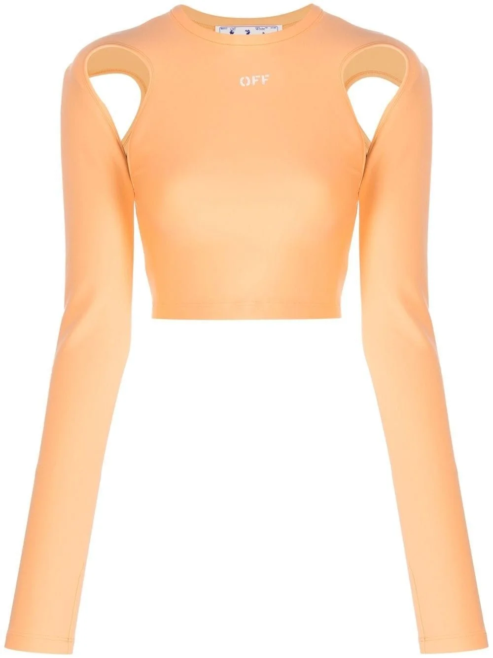 cut-out long-sleeve crop top Off-White updates a classic crew-neck silhouette with cut-outs and a contrasting logo print to the front, speaking to the brand's contemporary approach and signature use of branding graphics. Made in Italy Composition Polyamide 86%, Spandex/Elastane 14% SIZE & FIT Model measurements Height 5 ft 10 in(1.79 m) Bust/Chest 31.1 in(79 cm) Hips 35.03 in(89 cm) Waist 24.01 in(61 cm) FittingInformation This piece fits true to size. We recommend you get your regular size Cut for a slim fit Made with a mid-weight stretch fabric Washing instructions Machine Wash