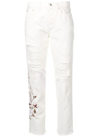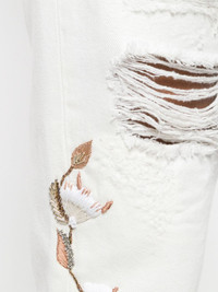 distressed flowers jeans Founded in 2013 by DJ and fashion designer Virgil Abloh, the Milan based fashion label Off-White was conceived to link the gap between streetwear and high fashion. These ecru white denim jeans combine hard-edged rips and frays with delicate floral embroidery at one side. Featuring a five pocket design, a button and zip fly, a straight leg, an embroidered floral design, distressed effects and frayed edges. Made in Italy Composition Cotton 100% SIZE & FIT Model measurements Height 5 ft 11 in(1.8 m) Bust/Chest 31.49 in(80 cm) Hips 35.82 in(91 cm) Waist 24.8 in(63 cm) Washing instructions Dry Clean Only