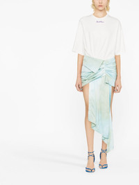 draped-skirt minidress Off-White's bold aesthetic is highlighted in this dress, blending the casual and the elegant, the T-shirt top offers a relaxed feel to the draped skirt design. Highlights - Blue/white - Cotton - Round neck - Short sleeves - Embroidered slogan - Draped detailing - Asymmetric hem Made in Italy Composition Cotton 100%, Viscose 100% SIZE & FIT Model measurements Height 5 ft 10 in(1.79 m) Bust/Chest 31.49 in(80 cm) Hips 35.03 in(89 cm) Waist 23.62 in(60 cm) FittingInformation Designed for a loose fit at the chest and waist with a close fit at the hips Made from a midweight non-stretch fabric This piece fits true to size – those with curvy hips may wish to take one size up Washing instructions Dry Clean Only