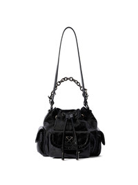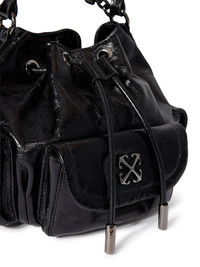 The Dumbo Bucket Bag embodies an urban-inspired aesthetic with its glossy leather finish and robust chain strap. A unique blend of style and functionality. - Smooth-grain leather construction - Adjustable chain strap for versatile carrying - Drawstring top fastening for secure closure - Front flap pocket with signature motif - Compact side pockets for additional storage - Interior lined for a refined finish - Made in Italy DETAILS - Lining: 5% Acrylic 95% Cotton, Material: 100% Calf Leather - Code: OWMY002F25LEA0011000