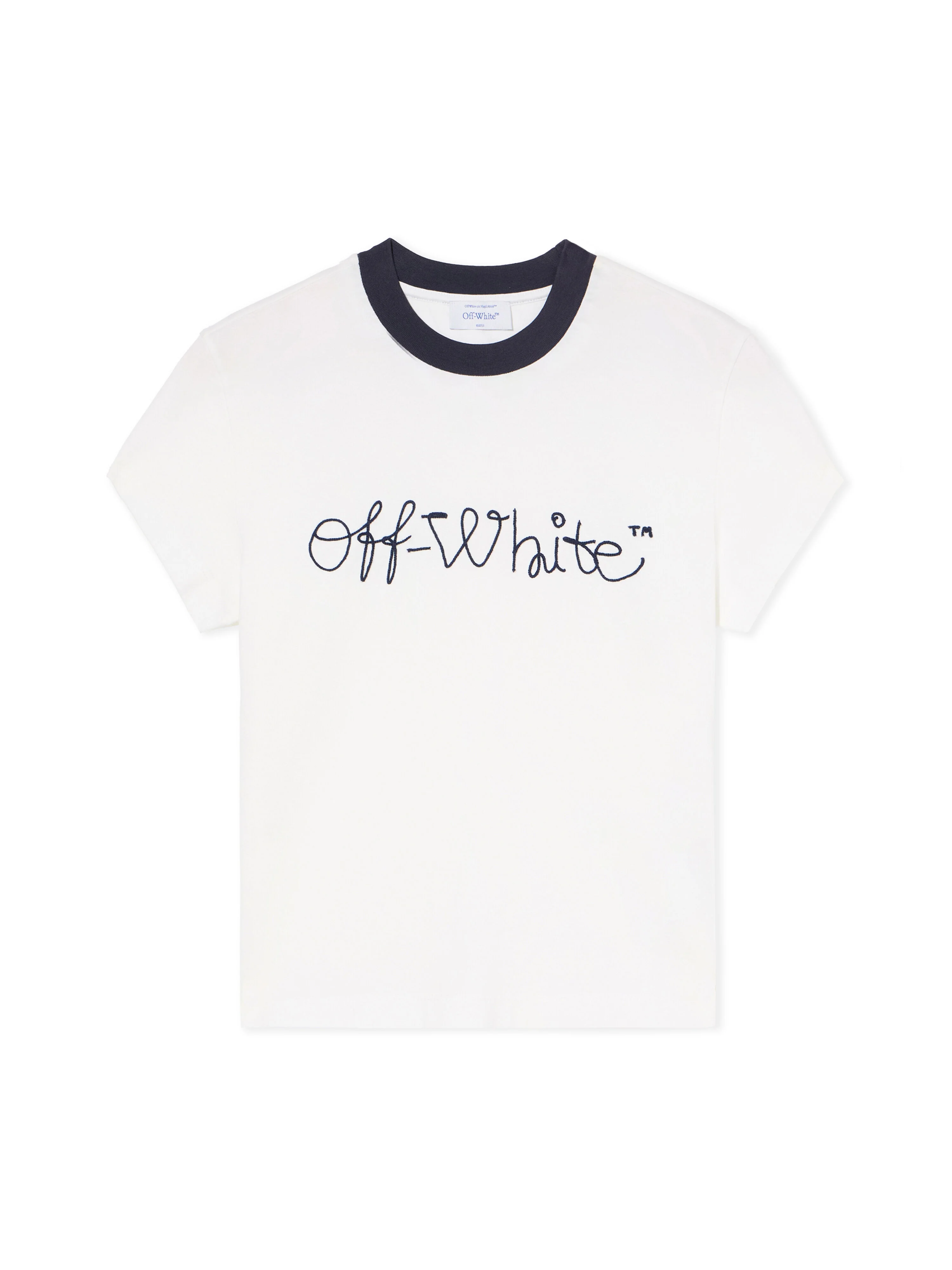 The Embroidered Script Logo Fitted Tee exemplifies Off-White™’s mastery in blending urban aesthetics with refined craftsmanship. This tee features an embroidered script logo, providing a subtle yet impactful statement on premium cotton fabric. - Embroidered script logo across the chest - Crew neckline with ribbed contrast trim - Short-sleeve design - Tailored fit accentuating silhouette - High-quality cotton construction DETAILS - Material: 100% Cotton, Rib Details: 5% Elastane 95% Cotton - Code: OWAA112F25JER0010148