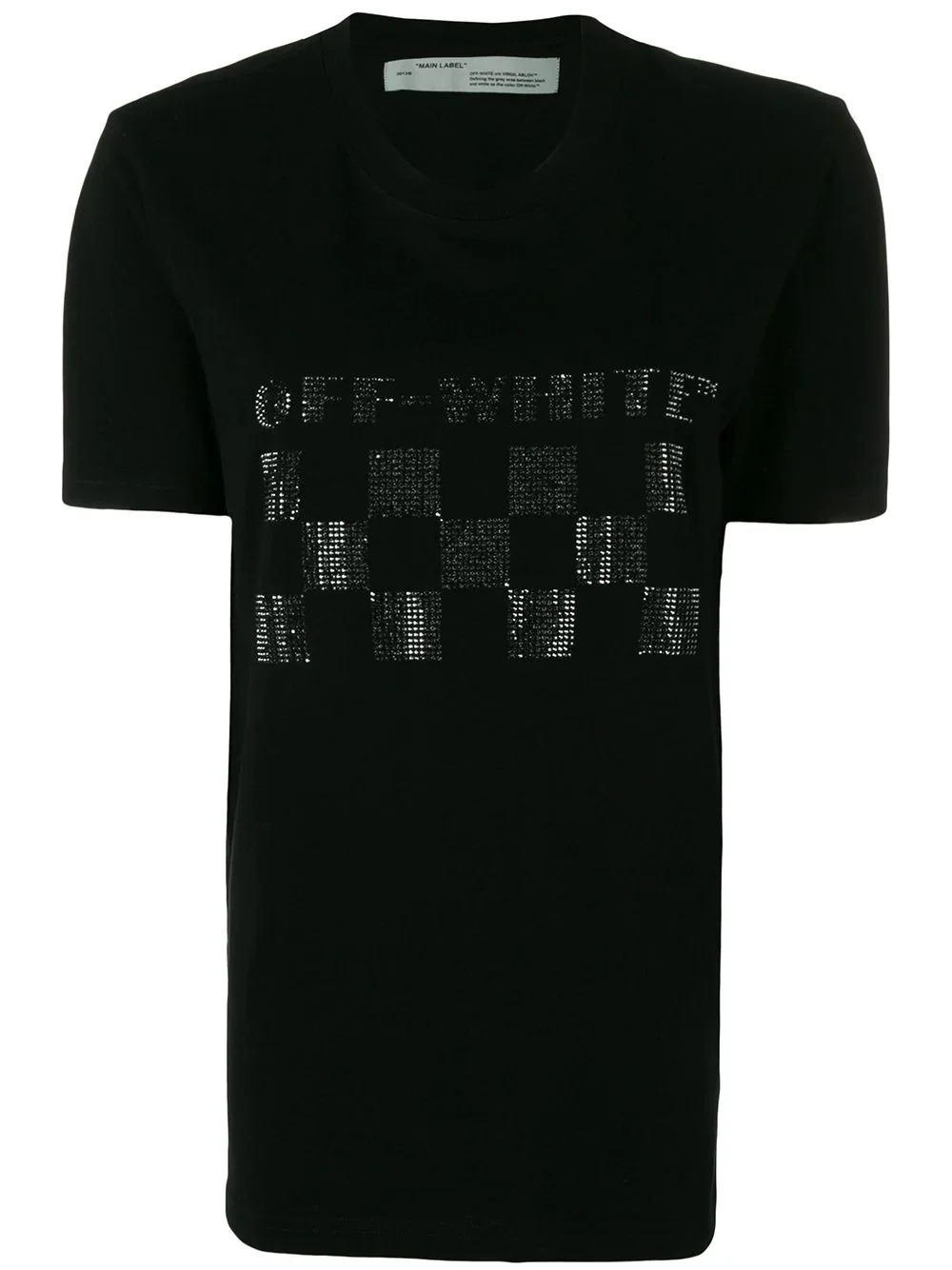 embellished logo print T-shirt Founded in 2013 by DJ and fashion designer Virgil Abloh, the Milan based fashion label Off-White was conceived to link the gap between streetwear and high fashion. This black embellished logo print T-shirt is crafted from cotton and features a round neck, short sleeves, a relaxed fit, a straight hem and crystal embellishments. Imported Composition Cotton 100%, Glass Fiber 100% Washing instructions Hand Wash