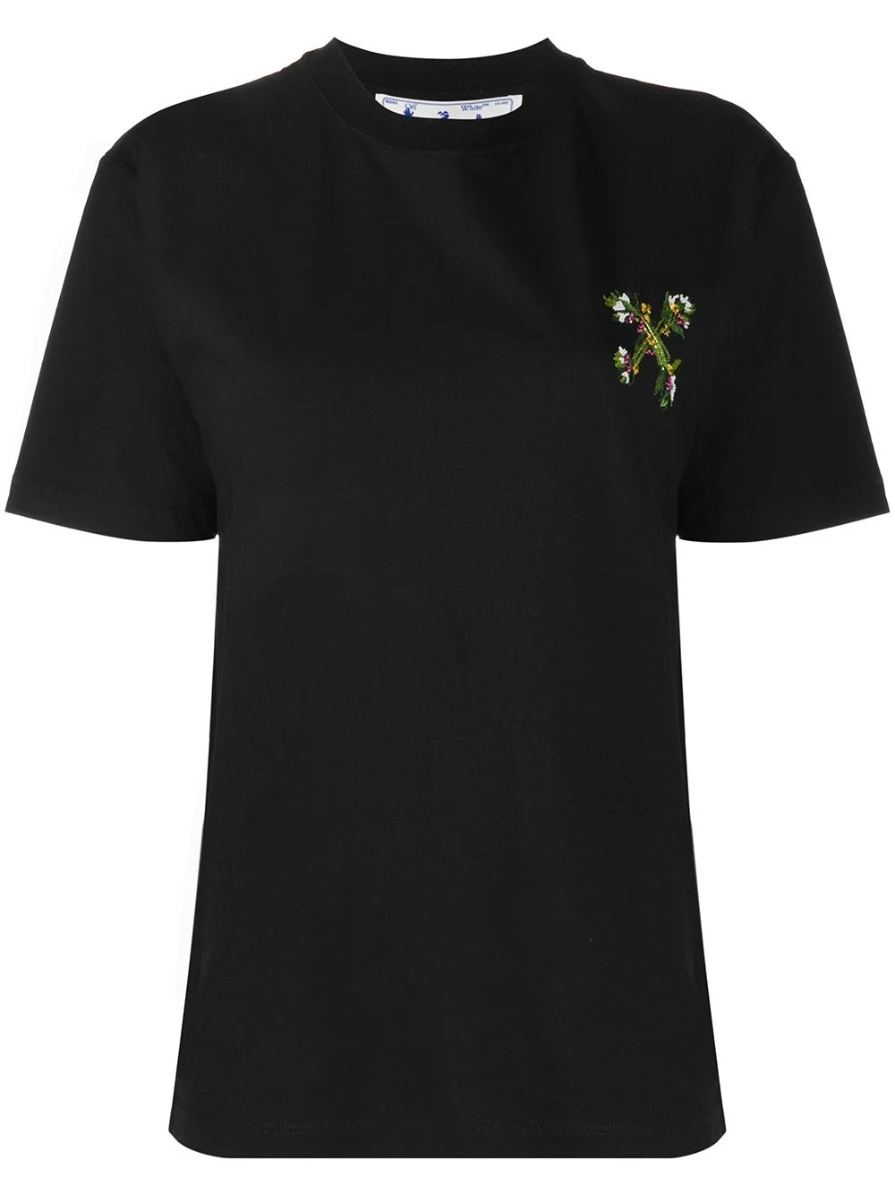 embroidered Arrow T-shirt Just like Cupid's, Off-White's iconic arrows are bound to make anyone fall in love. Exhibit A: this embroidered Arrow T-shirt. Looks like someone has a new crush. Highlights - Black/multicolour - Cotton - Signature arrows motif - Embroidered logo at the chest - Short sleeves - Round neck - Straight hem Made in Italy Composition Cotton 100% Front: Viscose 60%, Glass Fiber 30%, Polyvinyl Acetate (PVA) 10% Trims: Cotton 95%, Elastane 5% Washing instructions Hand Wash