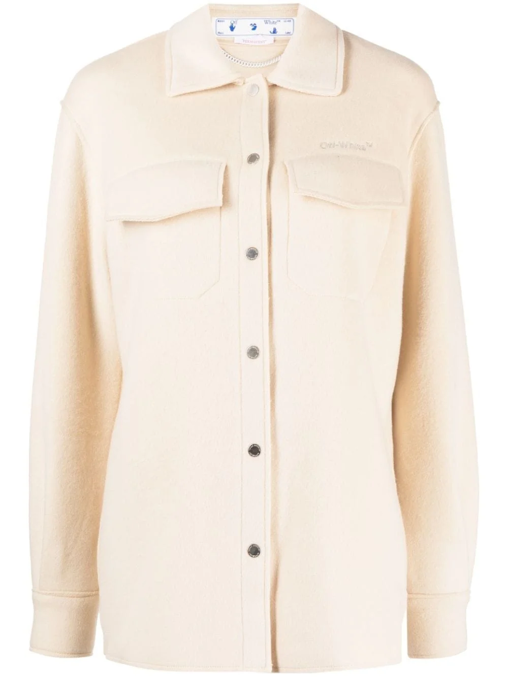 embroidered logo shirt jacket embroidered logo shirt jacket from OFF-WHITE featuring beige, virgin wool blend, classic collar, front button fastening, embroidered logo at the chest, chest flap pockets, curved hem, drop shoulder and buttoned-cuff sleeves. Made in Italy Composition Outer: Virgin Wool 78%, Polyamide 22% SIZE & FIT Model measurements Height 5 ft 9 in(1.76 m) Bust/Chest 31.1 in(79 cm) Hips 35.03 in(89 cm) Waist 24.4 in(62 cm) FittingInformation Designed to be unstructured, offering a loose fit throughout Made from a midweight non-stretch fabric This piece fits true to size – take your usual size