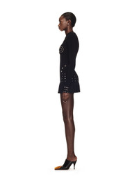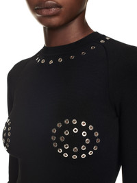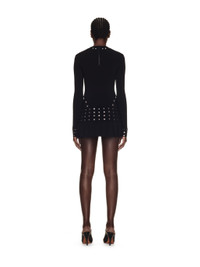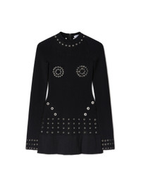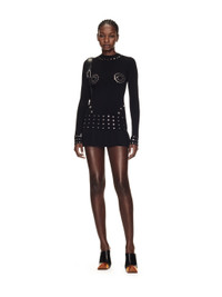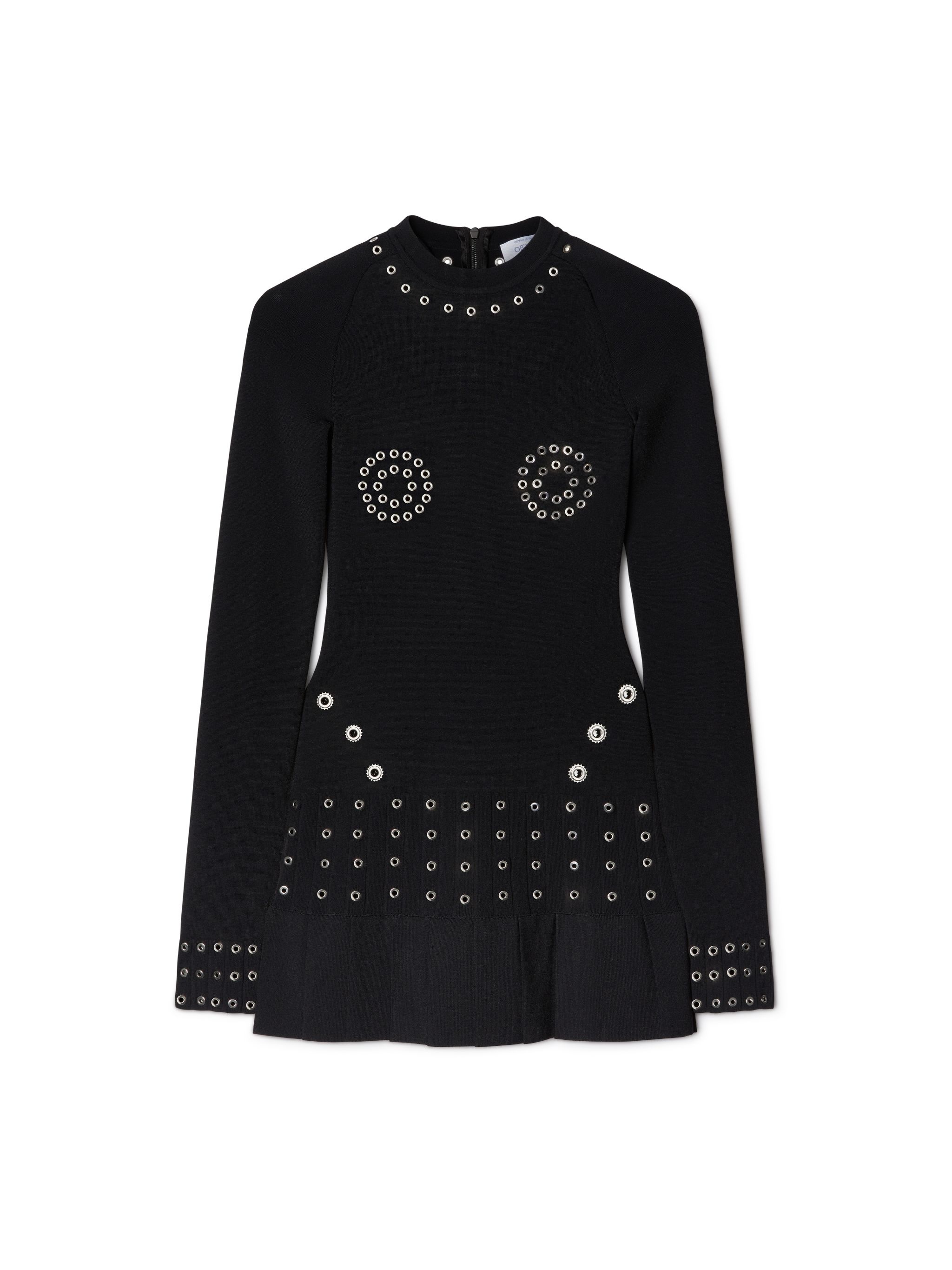Black mini leather pleated dress with eyelets metal details all over MATERIALS 13% Polyester 2% Polyurethane 21% Polyamide Trims: 100% Brass Trims: 100% zamac 64% Viscose FITTING Model Nicole Onwuchekwa wears size 40 Height: 5’ 95" (177 cm) Waist: 24” (61 cm) Hips: 35” (89 cm)