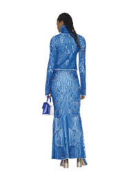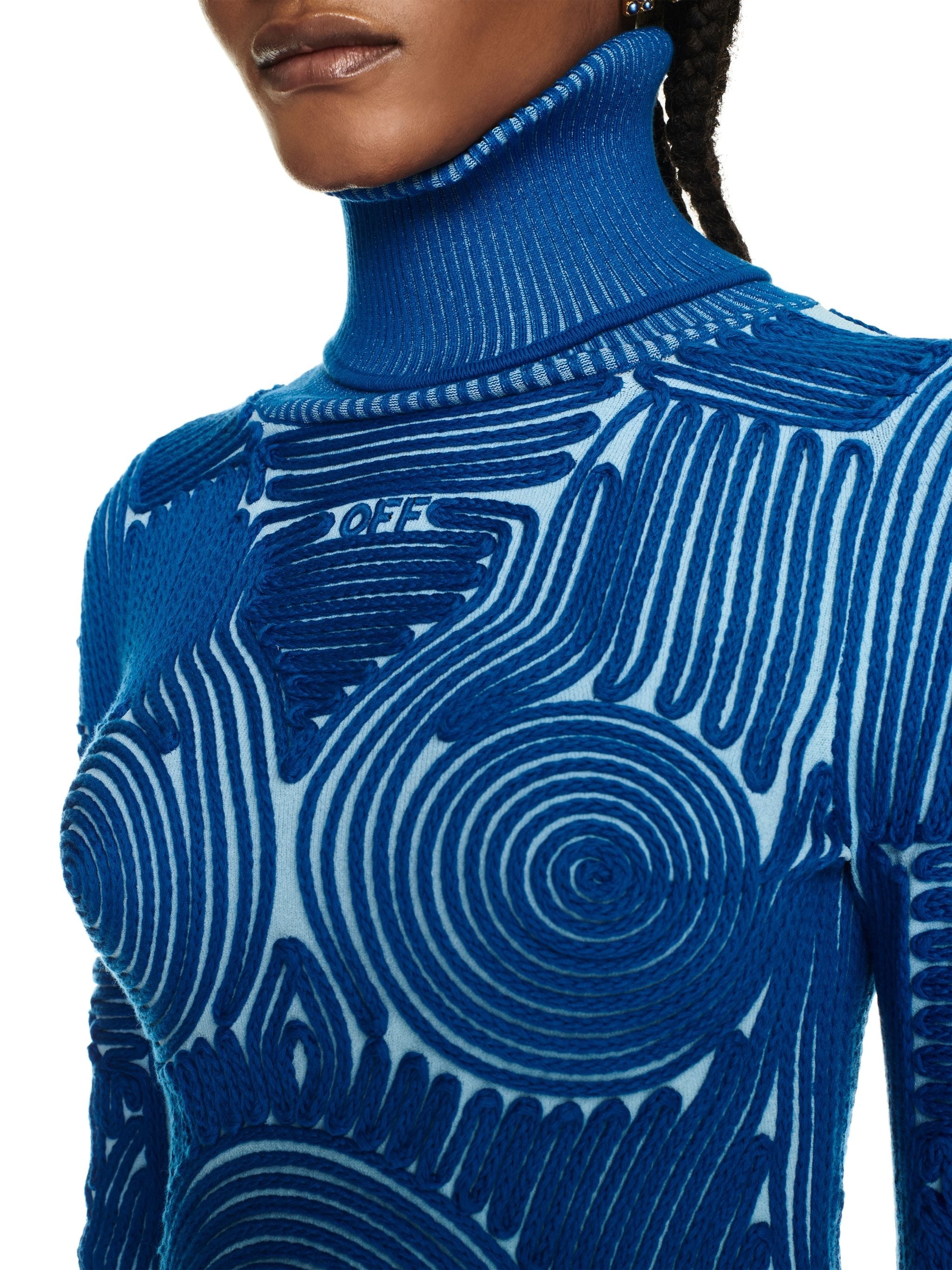 Light blue long sleeves knitwear with blue knit line details. Turtleneck collar. MATERIALS 17% Polyester 83% Viscose FITTING Model Blessing wears size S Height: 5’ 8" (178 cm) Bust: 30’ 3" (77 cm) Waist: 23” (59 cm)