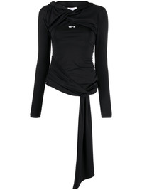 Fluid Jer Twist hooded top Known for elevating casual pieces, Off-White presents this hooded top. Crafted from stretch jersey, it boasts a twisted silhouette accentuated by an asymmetric hem and a long sash detail. Highlights - Black/white - Stretch-jersey - Logo print at the chest - Twist detailing - Sash detail - Classic hood - Long sleeves - Asymmetric hem Made in Italy Composition Viscose 90%, Elastane 10% SIZE & FIT Model measurements Height 5 ft 10 in(1.77 m) Bust/Chest 28.74 in(73 cm) Hips 35.82 in(91 cm) Waist 24.4 in(62 cm) FittingInformation Designed for a close fit throughout The narrow-cut sleeves offer a close fit at the arms Made from a midweight stretch fabric, this piece offers elasticity and flexibility when worn This piece fits close in all sizes – take your usual size Washing instructions Hand Wash