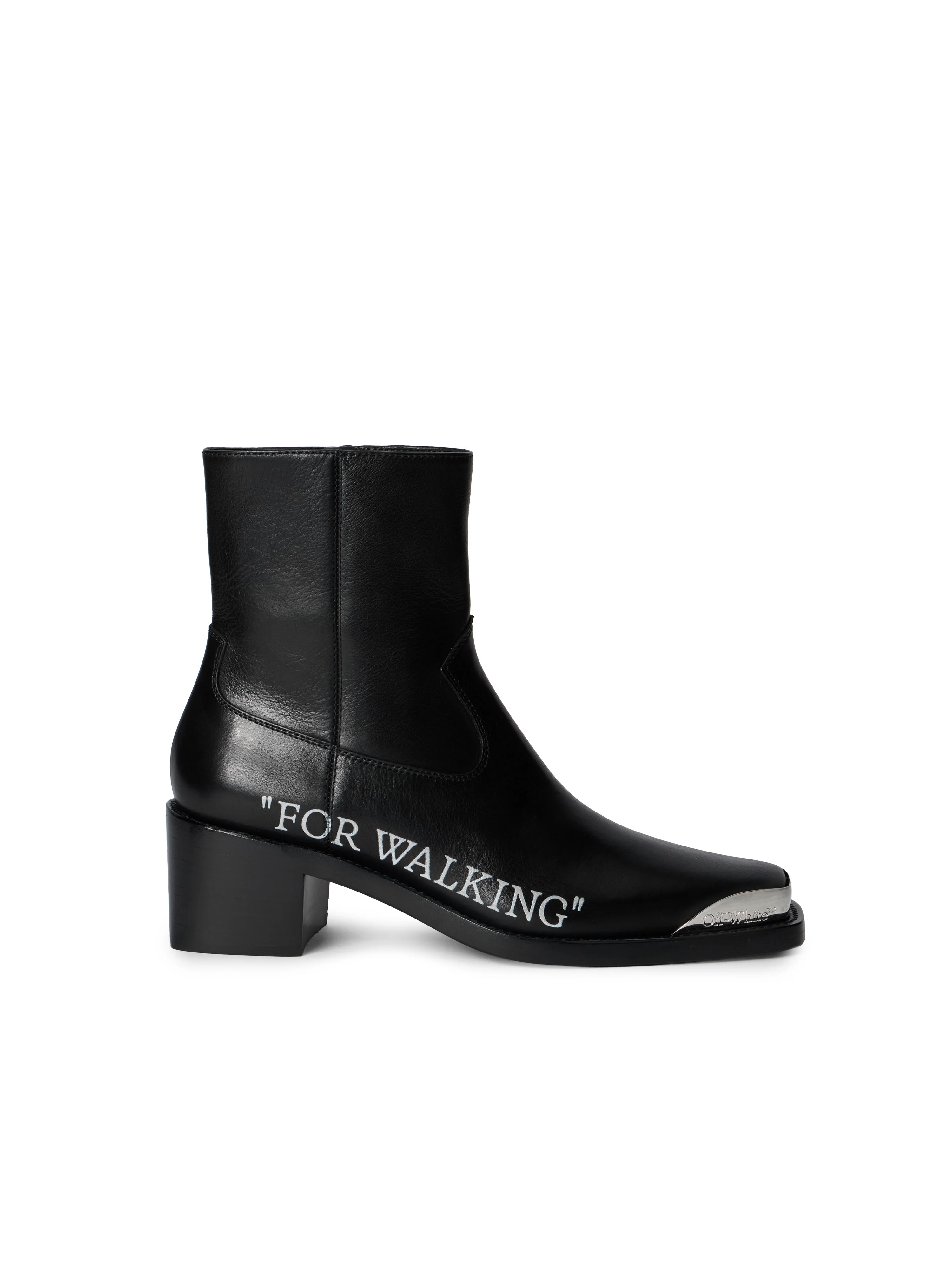 These "For Walking" Texan ankle boots in smooth-grain leather embody a refined silhouette with distinctive detailing. - Square toe design - Side zip fastening - Signature text along the side - Metallic accent at toe - Block heel construction - Leather lining - Robust sole - Smooth-grain leather finish - Made in Italy DETAILS - Lining: 100% Bovine Leather, Sole: 100% Bovine Leather, Upper Shoe: 100% Bovine Leather - Code: OWID05EF25LEA0011001