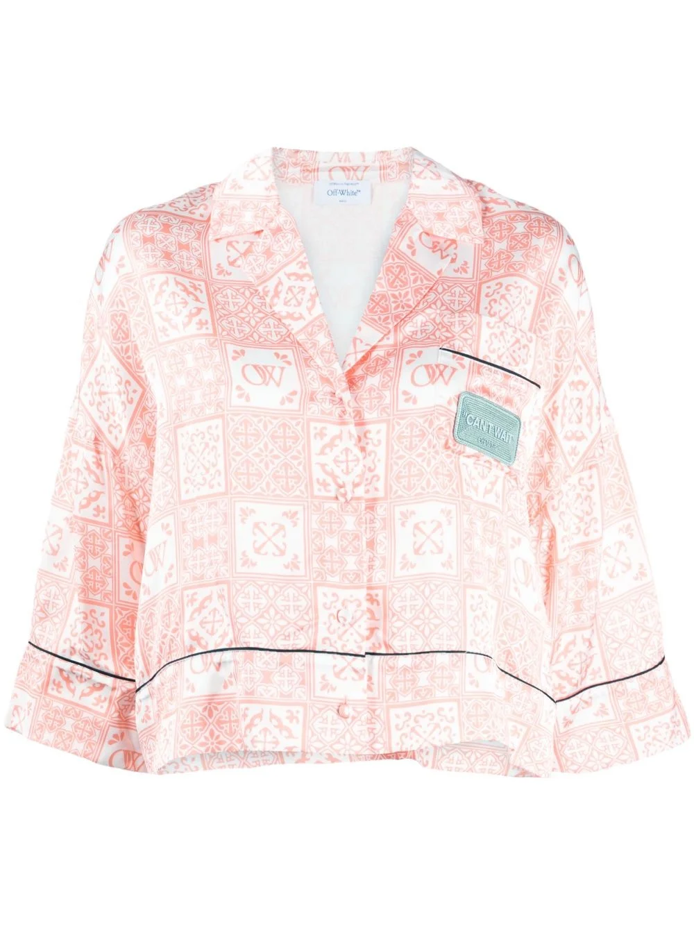 graphic-print satin shirt Inspired by traditional tiles, the graphic print that adorns this shirt integrates Off-White's distinctive Arrows motif. The silhouette is made from lustrous satin and features a contrasting logo applique on the chest. Highlights - Rose pink/white/black - All-over graphic print - Signature arrows motif - Applique logo - Torchon piping detail - Camp collar - Front button fastening - Three-quarter length sleeves - Straight hem - Cropped Made in Italy Composition Viscose 100% SIZE & FIT Model measurements Height 5 ft 10 in(1.77 m) Bust/Chest 31.49 in(80 cm) Hips 35.43 in(90 cm) Waist 25.19 in(64 cm) FittingInformation Designed to be unstructured, offering a loose fit throughout Made from a lightweight non-stretch fabric This piece fits true to size – take your usual size Washing instructions Dry Clean Only