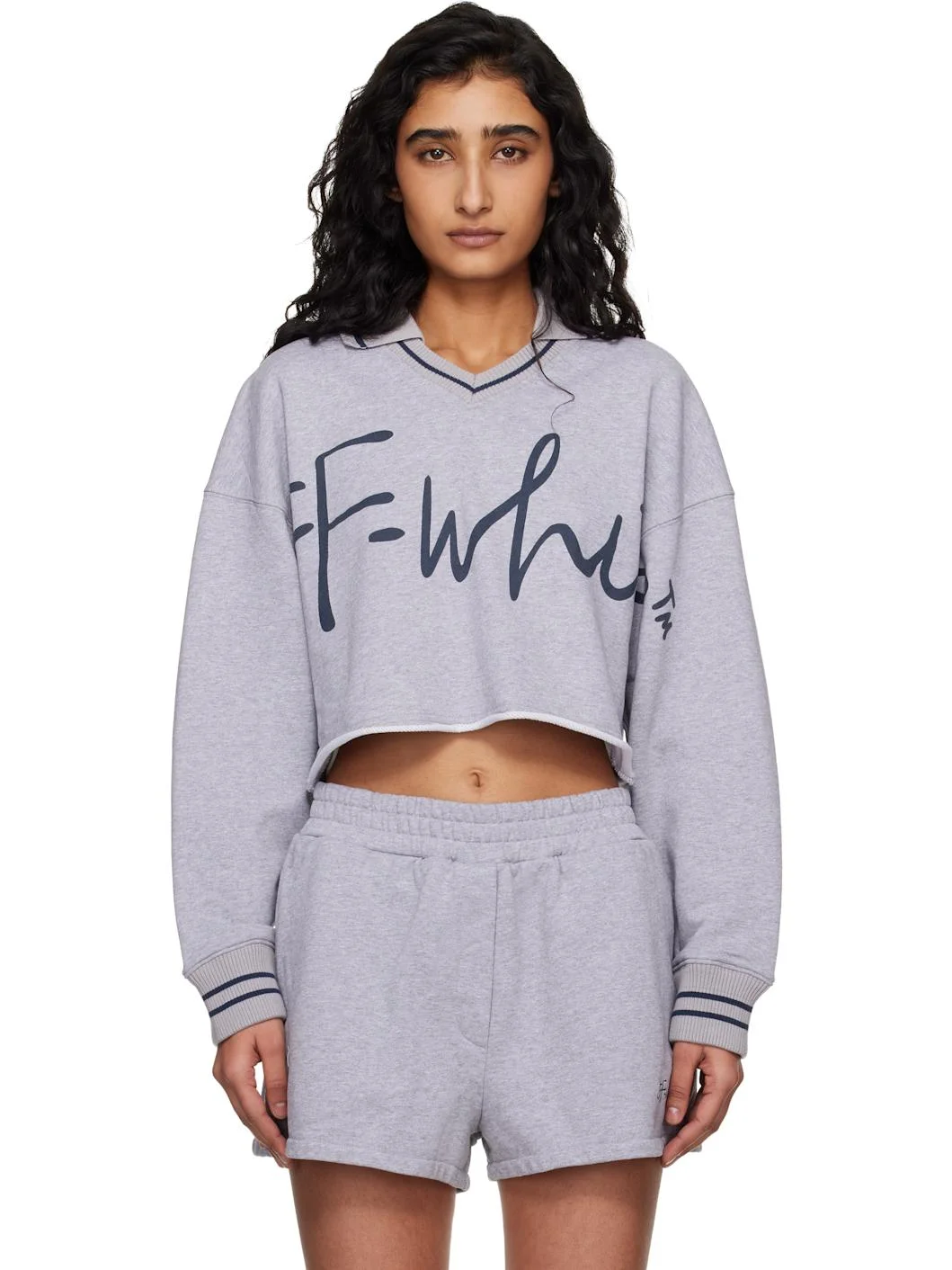 French terry polo. · Rib-knit spread collar, V-neck, and cuffs · Stripes at collar and cuffs · Logo printed at front · Rolled edge at cropped hem · Dropped shoulders Supplier color: Gray melange 100% cotton. Made in Bulgaria 261607F108002