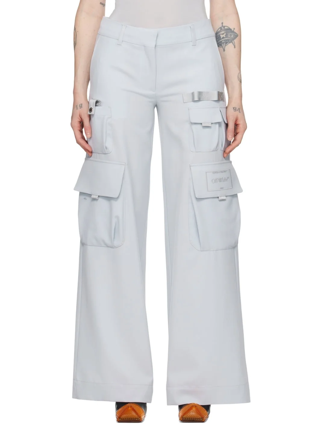Virgin wool gabardine trousers. Webbing trim throughout. · Belt loops · Four-pocket styling · Zip-fly · Cargo pockets · Logo embroidered at front · Darts at back Supplier color: Arctic ice Body: 100% virgin wool. Lining: 100% cotton. Made in Italy 241607F087002