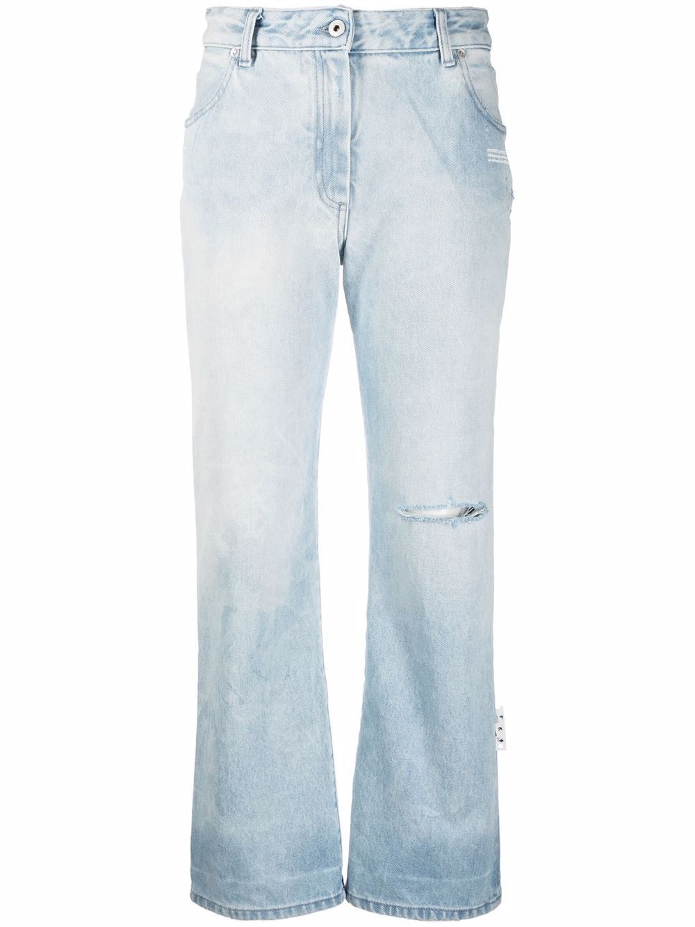 Light blue cotton high-rise distressed straight-leg jeans from OFF-WHITE featuring washed denim, distressed effect, belt loops, front button and zip fastening, classic five pockets and cropped. Highlights - Light blue - Cotton - Washed denim - Distressed effect - Belt loops - Front button and zip fastening - Classic five pockets - Cropped Made in Italy Composition lining: Cotton 100% outer: Cotton 100%