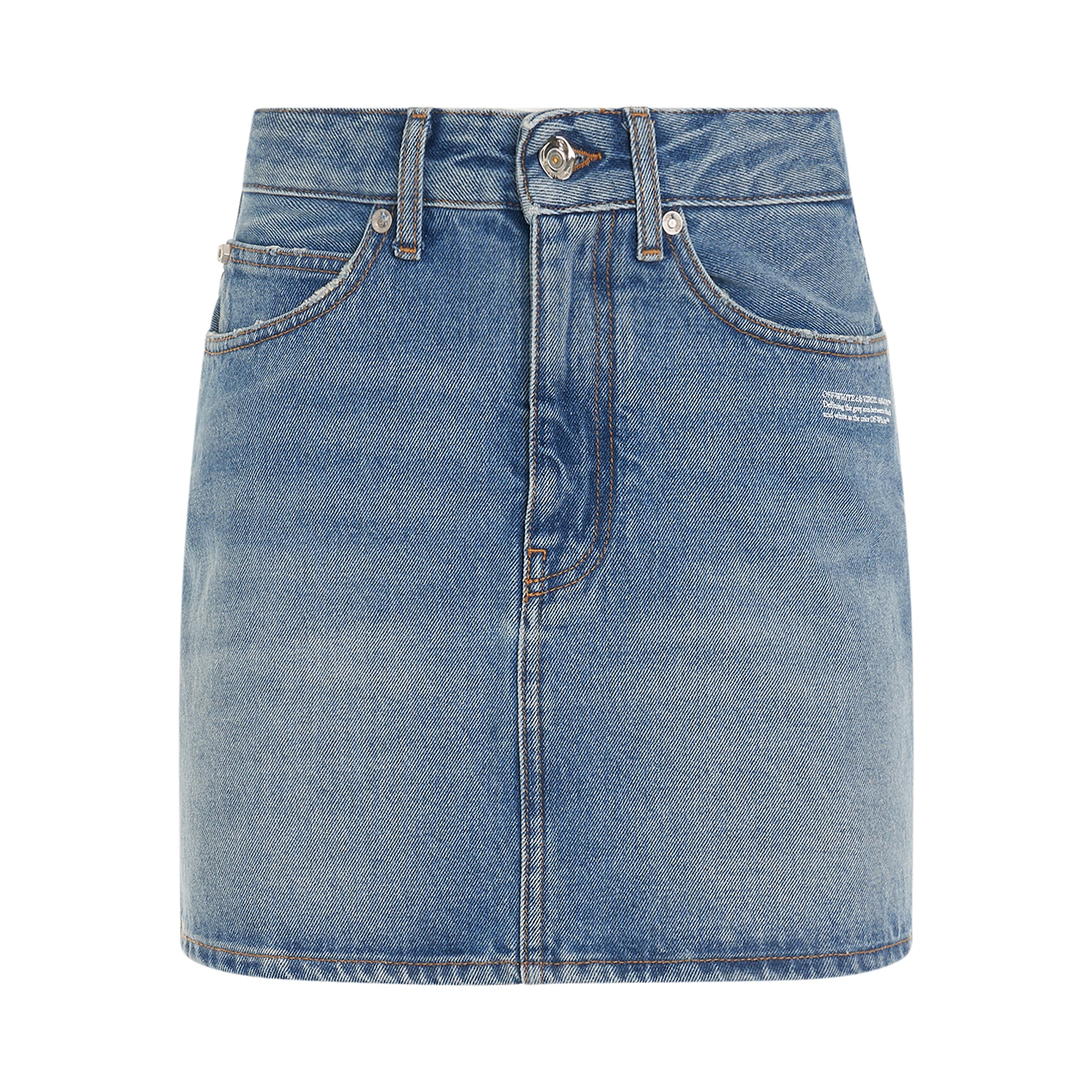 The Off-White high-waisted mini denim skirt combines streetwear-inspired elements with a timeless denim silhouette. The skirt is crafted in blue denim and features a thigh-length cut, giving it a stylish and contemporary look. It is designed with a classic five-pocket layout, reminiscent of Western-inspired designs. This combination of modern streetwear aesthetics and traditional denim elements creates a unique and fashionable piece. • Composition: Lining: Cotton 100% • Outer: Cotton 100% • Timeless denim silhouette • Thigh-length • Classic five pockets SKU: OWYF005C99DEN0064501