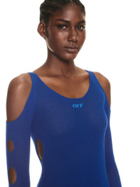 Blue long dresss featuring holes on long sleeves. Light blue Off-White logo at front. MATERIALS 17% Polyester 83% Viscose FITTING Bust 0cm Height 0cm Hips 0cm Waist 0cm