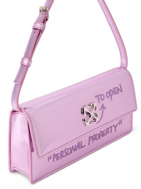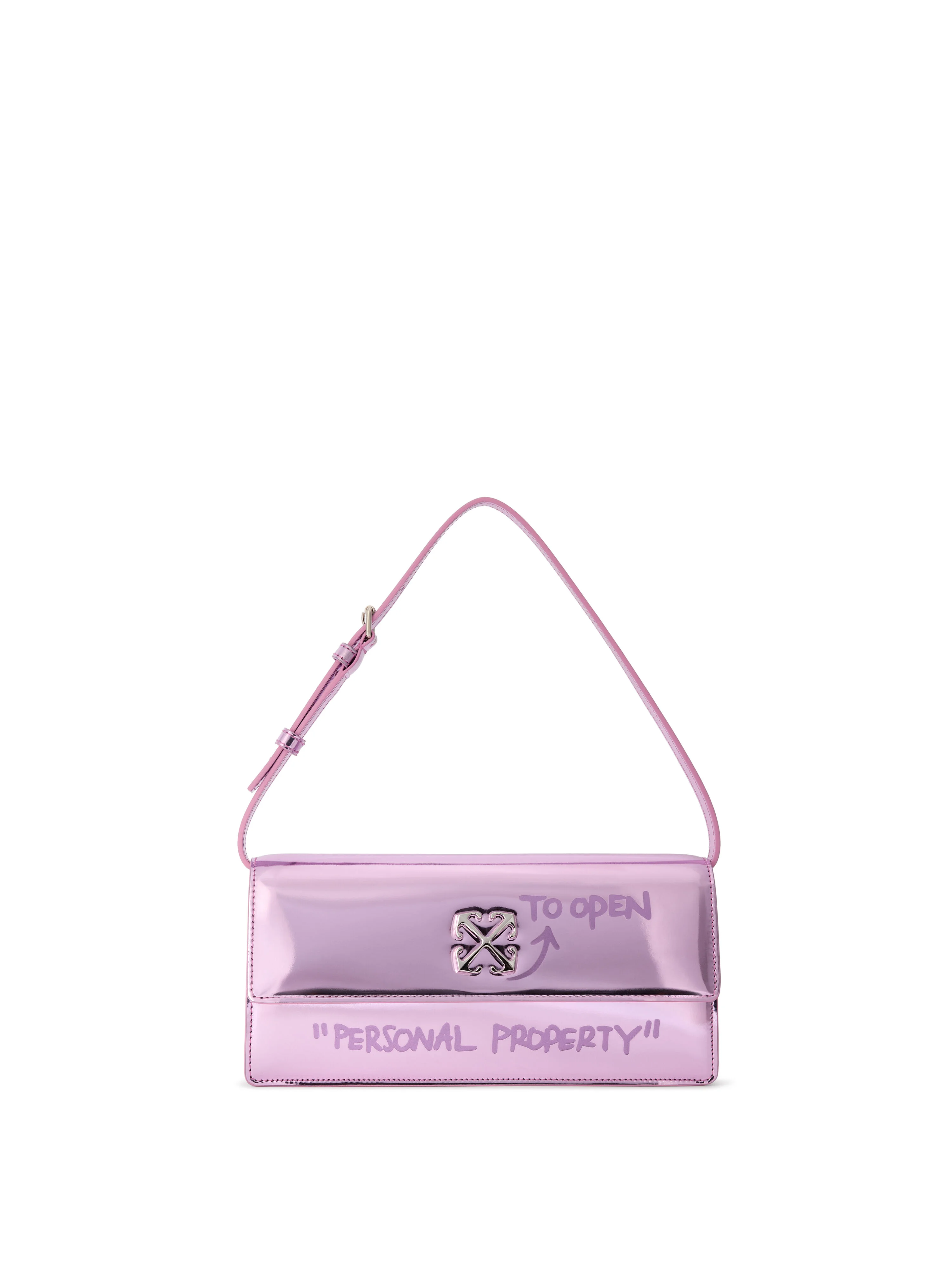 Patent leather shoulder bag with signature embossed motifs and adjustable strap. - Rectangular silhouette with flap-over magnetic closure - Embossed arrow motif and "Personal Property" text at front - Rear "Pocket" inscription with functional compartment - Adjustable shoulder strap for versatile wear - Crafted in high-shine patent leather - Signature urban design elements - Made in Italy DETAILS - Coating: 100% Polyurethane, Material: 100% Polyester, Lining: 100% Polyester - Code: OWNN172F25FAB0023232