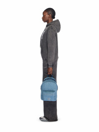 Denim backpack featuring embroidered detail and metal hardware. - Textile denim construction - Front zip pocket - Embroidered quote motif - Adjustable padded shoulder straps - Rear top handle - Interior logo patch - Metal arrow hardware DETAILS - Material: 100% Cotton, Lining: 5% Acrylic 95% Cotton, Material: 100% Calf Leather - Code: OWNB004F25DEN0014145