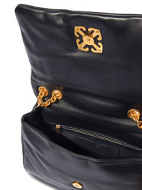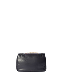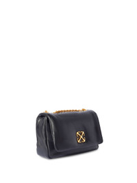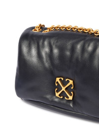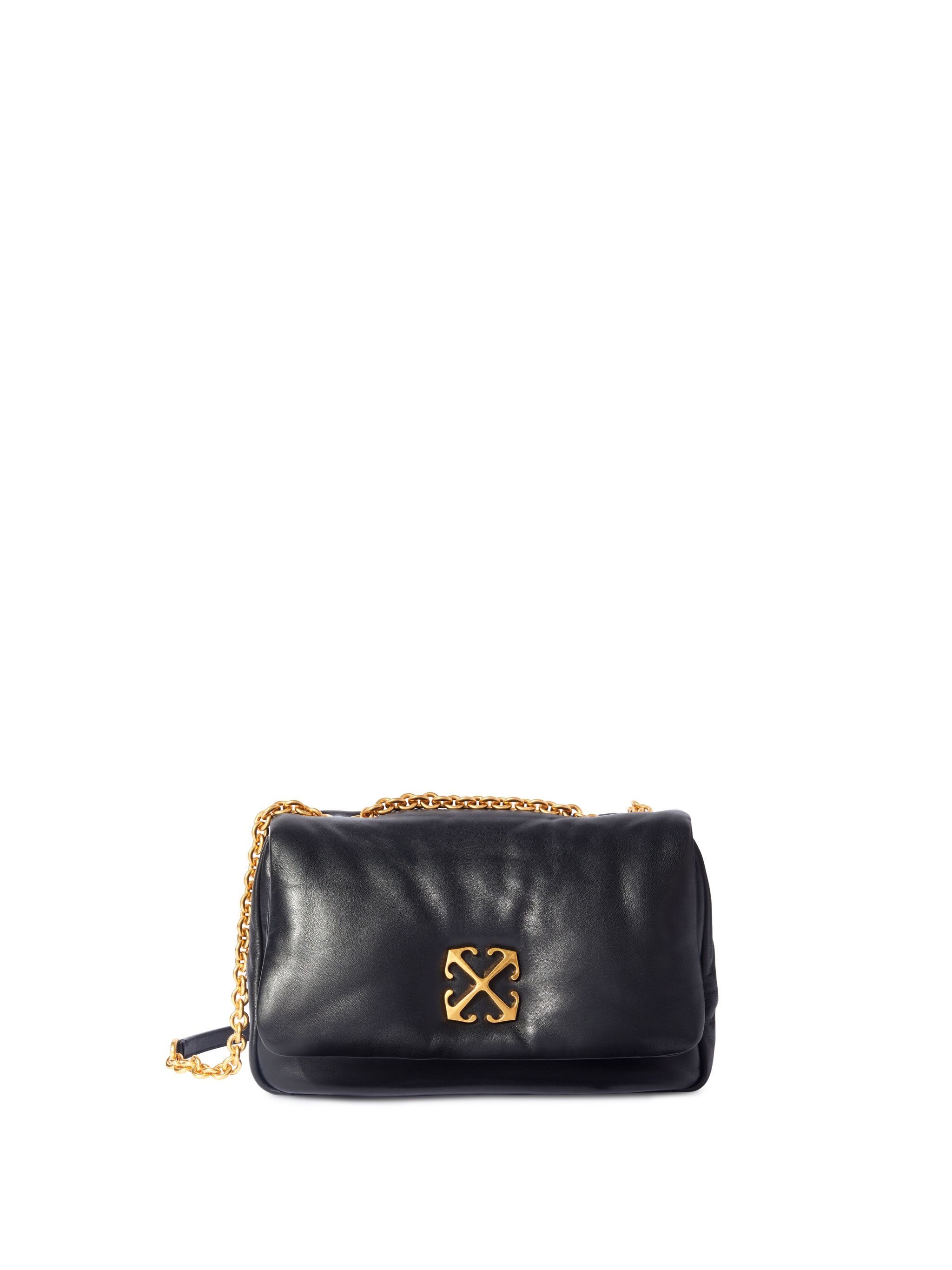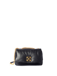 Black jitney puffer nana bag featuring gold arrows at front. Gold chained shoulder strap. MATERIALS Outer: 100% Calf Leather Lining: 5% Acrylic Lining: 95% Cotton FITTING Bust 0cm Height 0cm Hips 0cm Waist 0cm