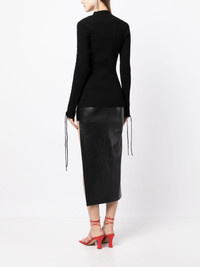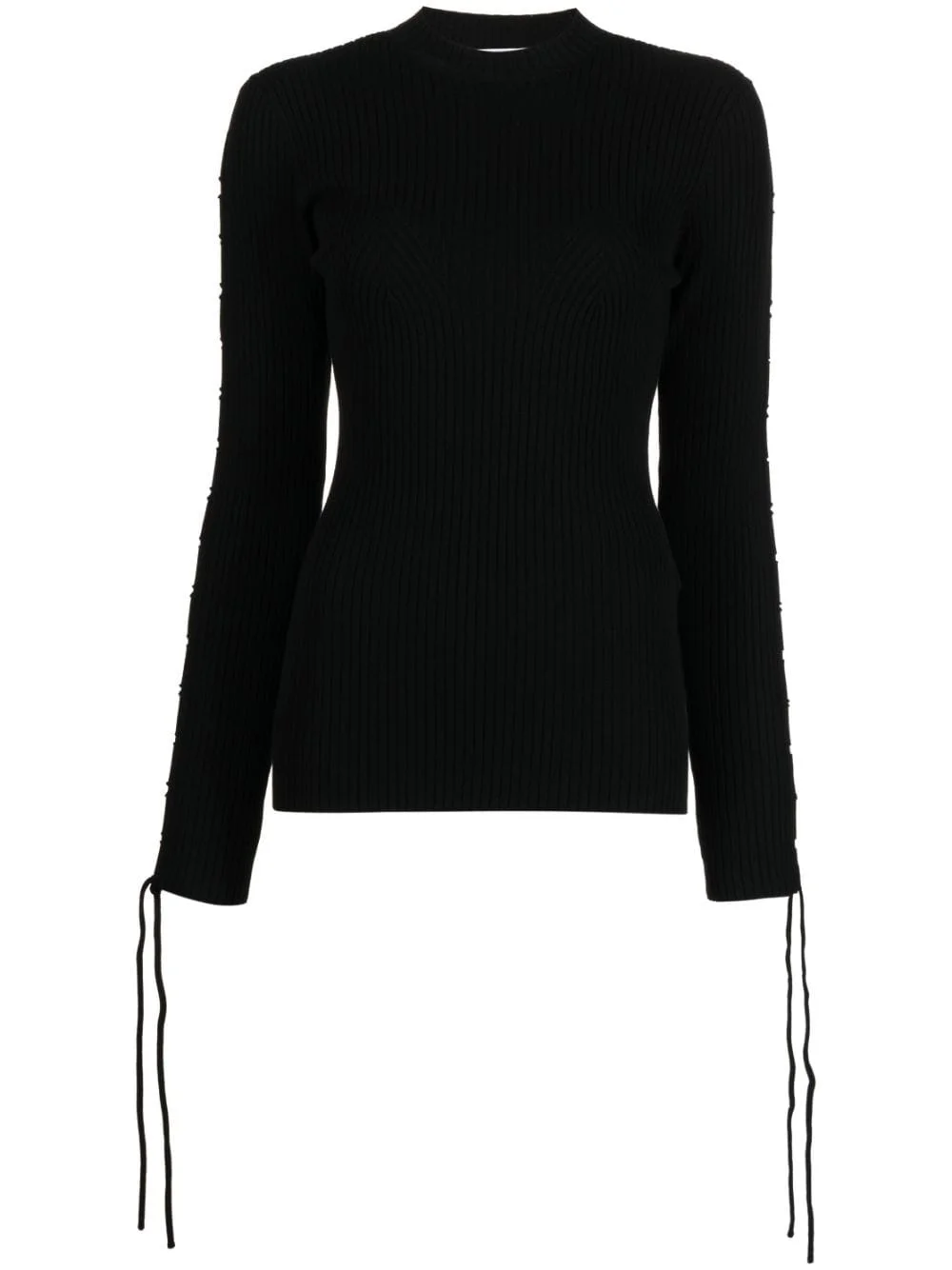 lace-detail ribbed top This top is emblematic of Off-White’s contemporary aesthetic. Arriving in a sleek black hue, the long-sleeve silhouette plays host to a textural ribbed finish while lace-up detailing at the sleeves lends a unique appeal. Highlights - Black - Fine ribbed - Lace-up detailing - Round neck - Long sleeves - Straight hem Made in Italy Composition Viscose 82%, Polyester 18% SIZE & FIT Model measurements Height 5 ft 11 in(1.8 m) Bust/Chest 28.34 in(72 cm) Hips 35.43 in(90 cm) Waist 23.62 in(60 cm) FittingInformation Designed for a close fit throughout The narrow-cut sleeves offer a close fit at the arms Made with a heavyweight knit, this piece offers some stretch This piece fits true to size – take your usual size Washing instructions Dry Clean Only