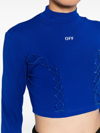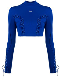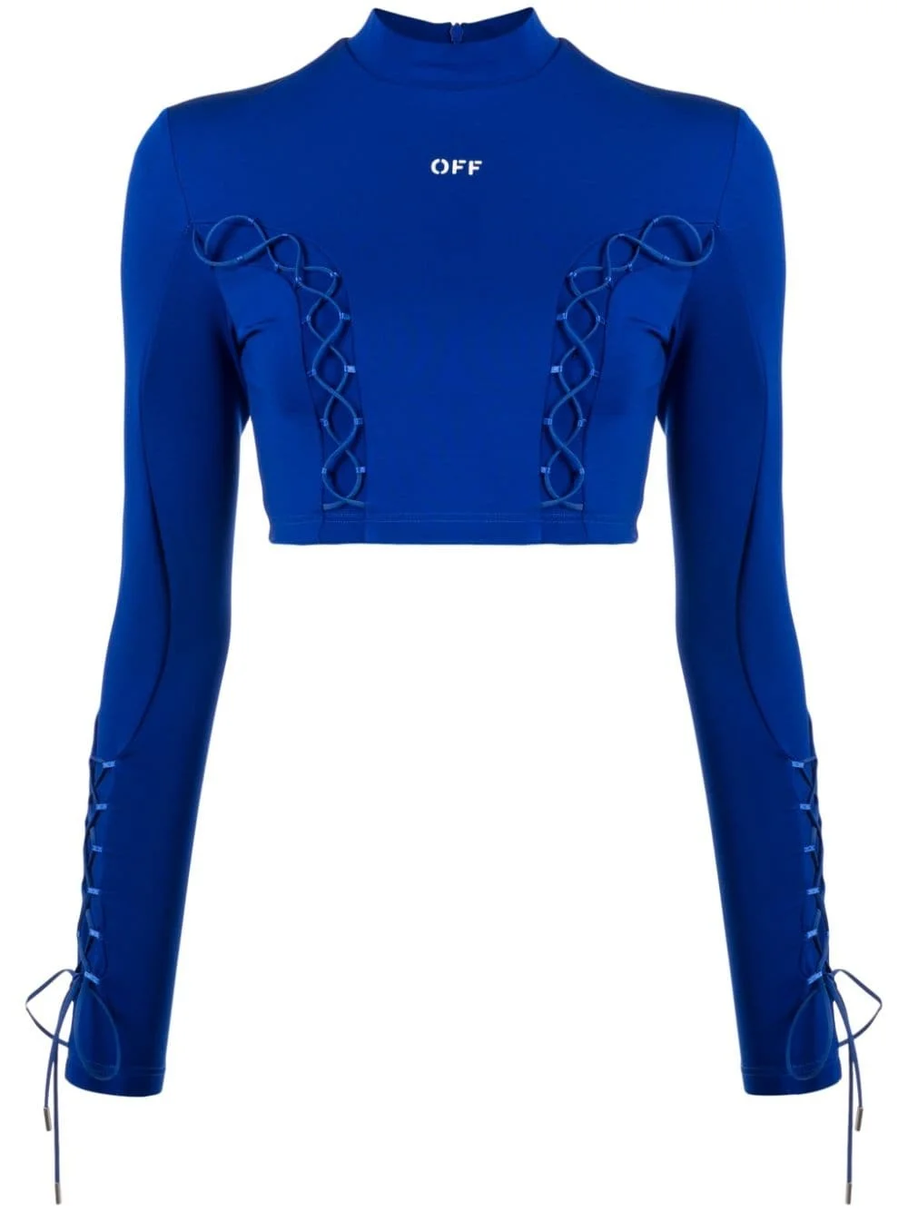 lace-up crop top This Off-White crop top captures attention with its electric-blue colourway. It's made from stretch fabric in a close-fitting silhouette, detailed with lace-up accents throughout the front and on the sleeves. A small logo print completes the look. Highlights - Electric blue - Stretch-design - Logo print at the chest - Lace-up detailing - Mock neck - Long sleeves - Straight hem - Cropped Made in Italy Composition Polyurethane 85%, Polyamide 9%, Elastane 6% SIZE & FIT Model measurements Height 5 ft 10 in(1.77 m) Bust/Chest 31.49 in(80 cm) Hips 35.43 in(90 cm) Waist 25.19 in(64 cm) FittingInformation Designed for a slim fit that sits just away from the body offering a close yet comfortable fit Made from a midweight stretch fabric, this piece offers elasticity and flexibility when worn This piece fits true to size – take your usual size Washing instructions Dry Clean Only
