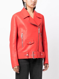leather biker jacket Off-White's penchant for larger than life design underpins the construction of this leather jacket. Presented in a vibrant red hue that recalls the brand's penchant for bold colour palettes, it's characterised by its asymmetric front zip fastening. Imported Composition Outer: Leather 100% Lining: Viscose 53%, Cupro 47% SIZE & FIT Model measurements Height 5 ft 10 in(1.77 m) Bust/Chest 31.49 in(80 cm) Hips 35.43 in(90 cm) Waist 25.19 in(64 cm) Washing instructions Dry Clean Only