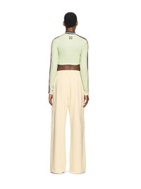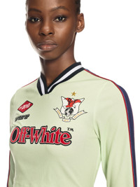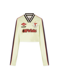 This long-sleeved t-shirt features soccer-inspired logos and badges and contrasting stripes on the v-neck and sleeves. Cropped fit. MATERIALS 100% Polyester 5% Elastane 95% Cotton FITTING BETTY WEARS SIZE S HEIGHT: 5' 9” (179 CM) BUST: 30” (76 CM) WAIST: 24“ (60 CM) HIPS: 34” (87 CM)