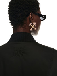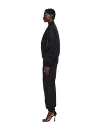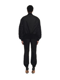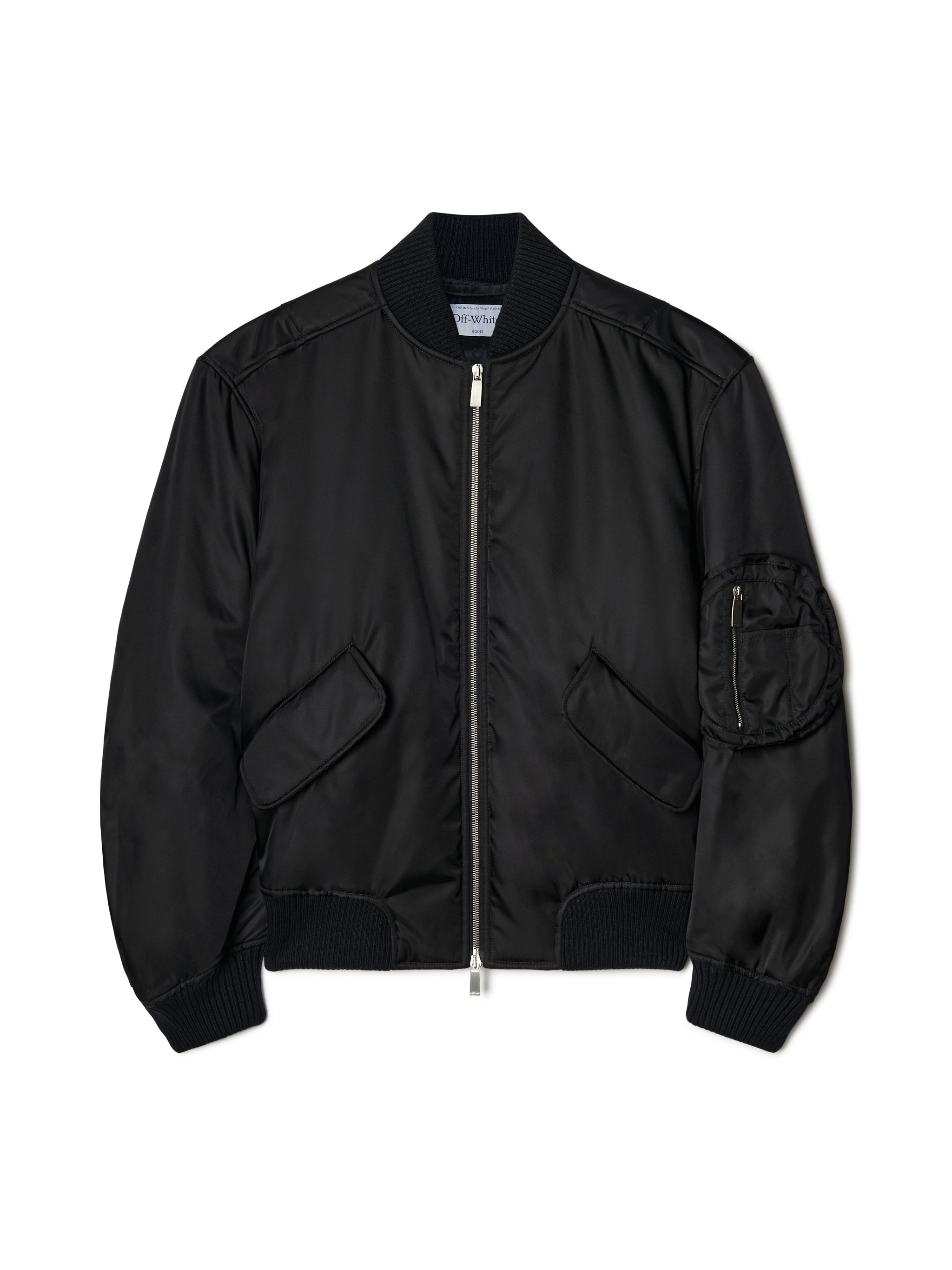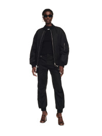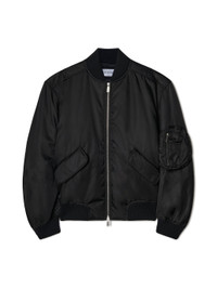 Black bomber with frontal zip closure.Zip pocket detail at slevees.Tonal arrow at back.Mockneck collar. MATERIALS Outer: 100% Polyamide Lining: 100% Viscose FITTING Model Nicole Onwuchekwa wears size 42 Height: 5’ 95" (177 cm) Chest: 32” (81 cm) Waist: 24” (61 cm)