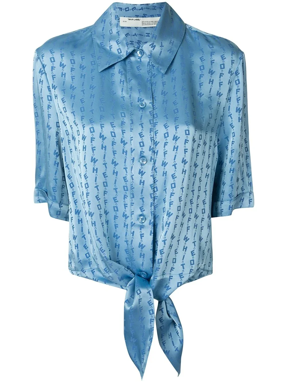 logo baseball knot blouse Ready to tie the knot? This logo baseball knot blouse from Off-White looks like the perfect match. "Happily ever after" worthy. Featuring an all-over logo print, a knot detail, half sleeves, a classic collar and a front button placket. Made in Italy Composition Acetate 53%, Viscose 47%