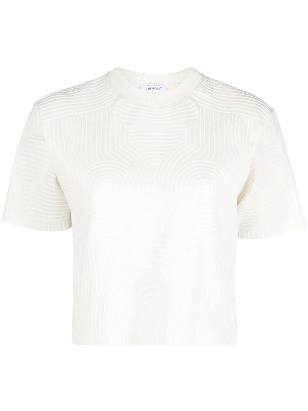 printed cotton T-shirt Boasting a contouring geometric pattern, this T-shirt is emblematic of Off-White’s experimental aesthetic. The print spotlights the brand’s ‘OFF’ logo at the chest. Highlights - White - Cotton - Lightweight jersey - Geometric print - Logo print to the front - Crew neck - Short sleeves - Straight hem Made in Italy Composition Cotton 100% SIZE & FIT Model measurements Height 5 ft 10 in(1.79 m) Bust/Chest 31.1 in(79 cm) Hips 35.03 in(89 cm) Waist 24.01 in(61 cm) FittingInformation Designed for a relaxed fit, this piece allows for comfort and movement when worn Made from a midweight non-stretch fabric, this piece offers minimal elasticity when worn This piece fits true to size – take your usual size Washing instructions Hand Wash