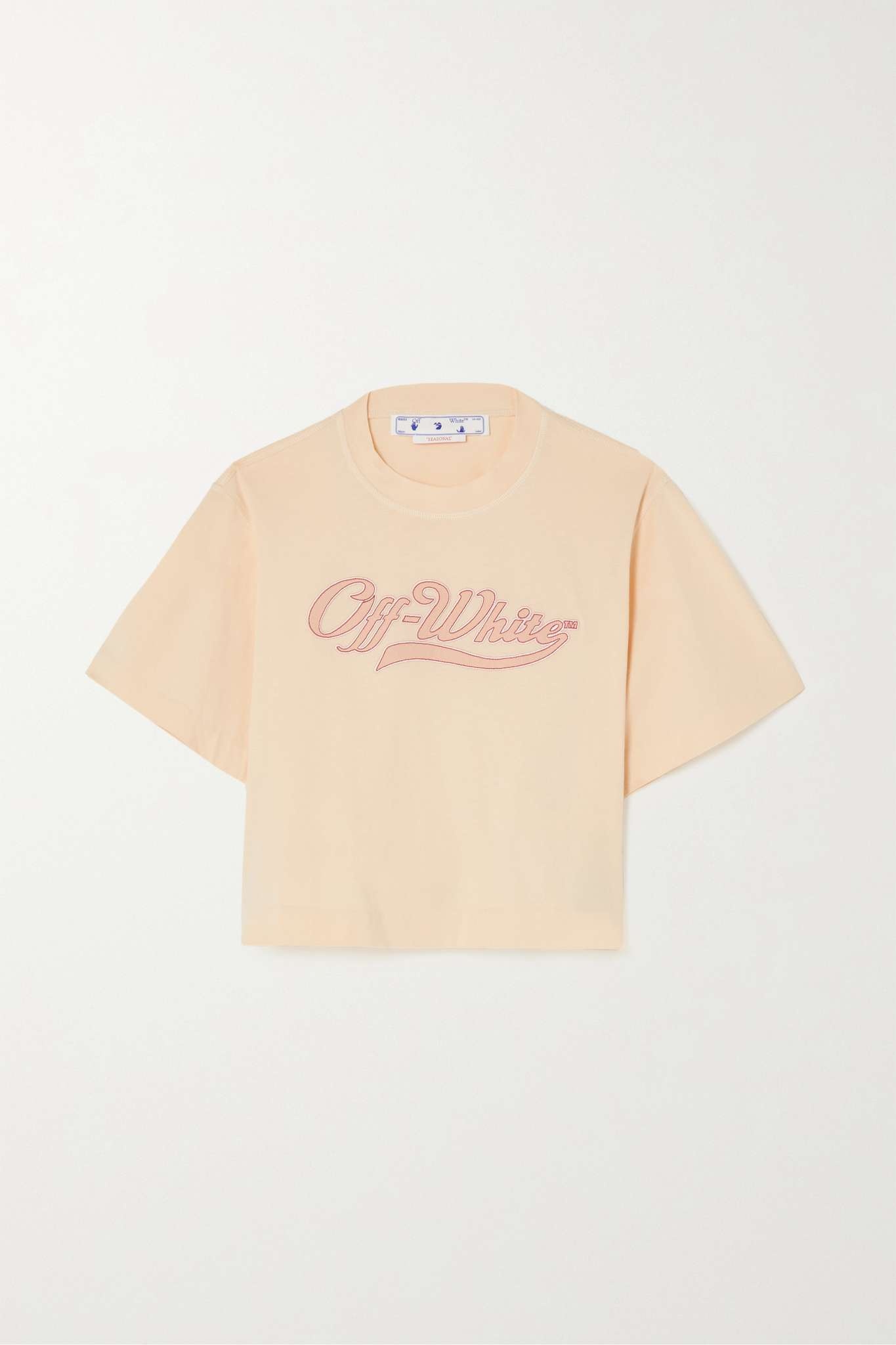 EDITORS'NOTES Cool and covetable each season, a logo tee is a fresh swap from plain styles. Off-White's version is cut from cotton-jersey and appliquéd with the label’s impactful signature. The cropped length will complement high-rise jeans, pants and shorts. SIZE & FIT - Fits true to size, take your normal size - Designed for a relaxed fit - Cropped length - Mid-weight, stretchy fabric - Model is 177cm/ 5'10" and is wearing a size Small DETAILS & CARE - Cream cotton-jersey - Slips on - 100% cotton - Machine wash