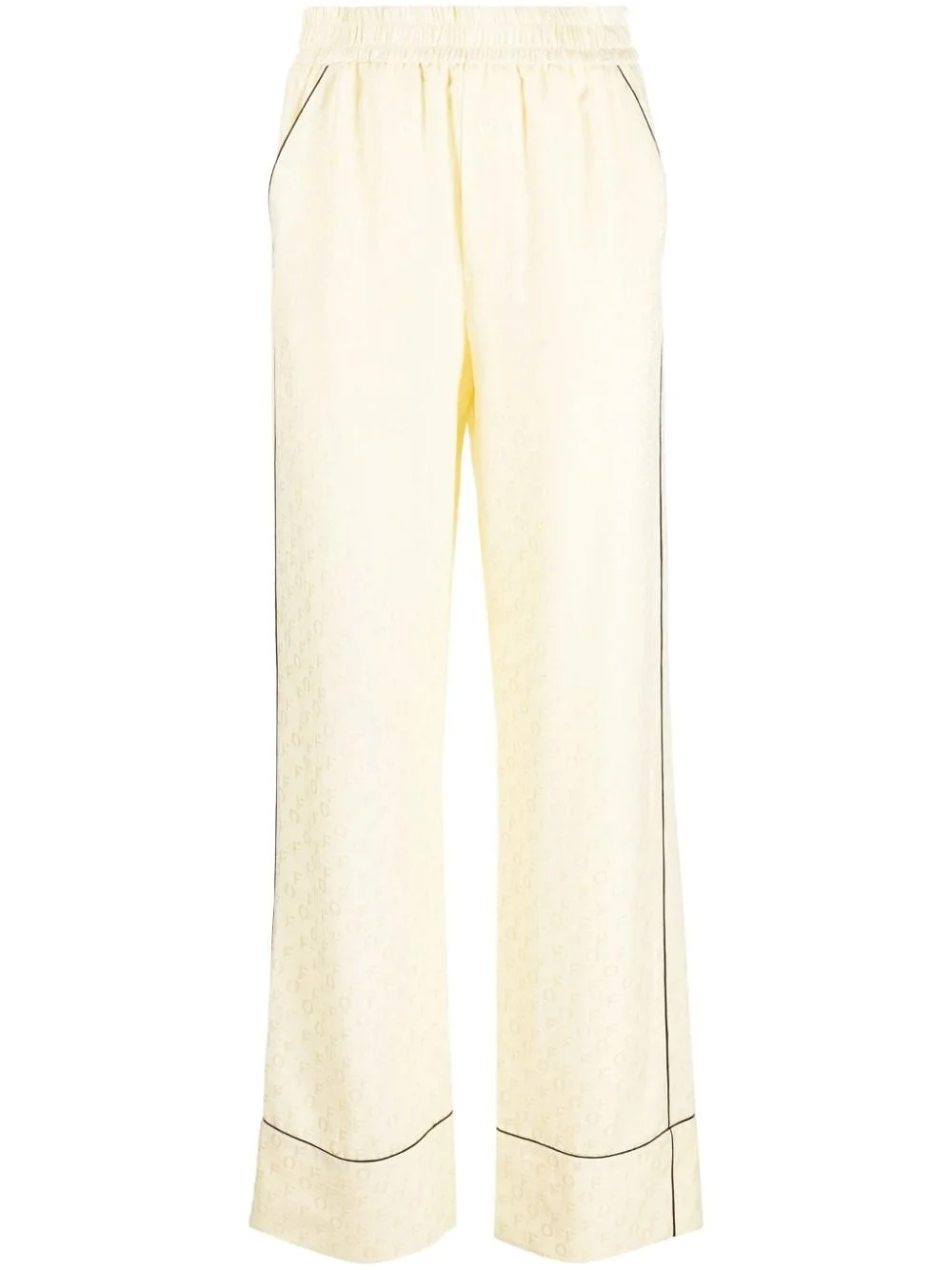 logo-jacquard elasticated trousers A subtle logo jacquard motif adorns the entirety of these silk-cotton blend Off-White trousers. They fall to a straight leg, boast an elasticated waistband and are finished with contrast piping, reminiscent of relaxed pyjama styles. Highlights - Light yellow - Silk-cotton blend - Jacquard logo motif - Piped-trim detailing - Elasticated waistband - Two side slash pockets - Rear patch pocket - Straight leg Made in Italy Composition Silk 56%, Cotton 44% SIZE & FIT Model measurements Height 5 ft 9 in(1.76 m) Bust/Chest 31.1 in(79 cm) Hips 35.03 in(89 cm) Waist 24.4 in(62 cm) FittingInformation Designed for a straight-leg fit, these trousers allow for a close fit at the waist and an unrestricted, comfortable fit over the leg The elasticated waist allows for a comfortable fit Made from a lightweight non-stretch fabric This piece fits true to size – take your usual size Washing instructions Dry Clean Only