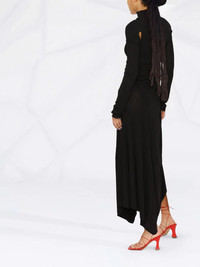Black/white logo-print cut-out dress from OFF-WHITE featuring logo print at the chest, round neck, long sleeves, cut-out detailing and fitted waistline. Highlights - Black/white - Logo print at the chest - Round neck - Long sleeves - Cut-out detailing - Fitted waistline Made in Italy Composition Viscose 100%
