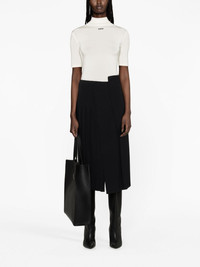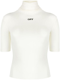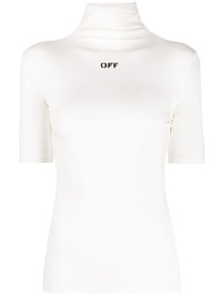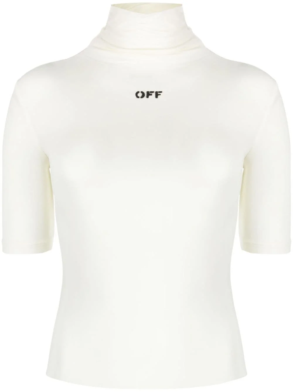 logo-print mock-neck top Cut to a mock neck silhouette Off-White's short sleeve top is printed with the signature logo on the front of the design. Highlights - White/black - Logo print to the front - Mock neck - Short sleeves Composition Viscose 95%, Spandex/Elastane 5% SIZE & FIT Model measurements Height 5 ft 11 in(1.8 m) Bust/Chest 34.3 in(87 cm) Hips 35.8 in(91 cm) Waist 24.8 in(63 cm) FittingInformation Designed for a close fit throughout Made from a midweight stretch fabric, this piece offers elasticity and flexibility when worn This piece fits true to size – take your usual size