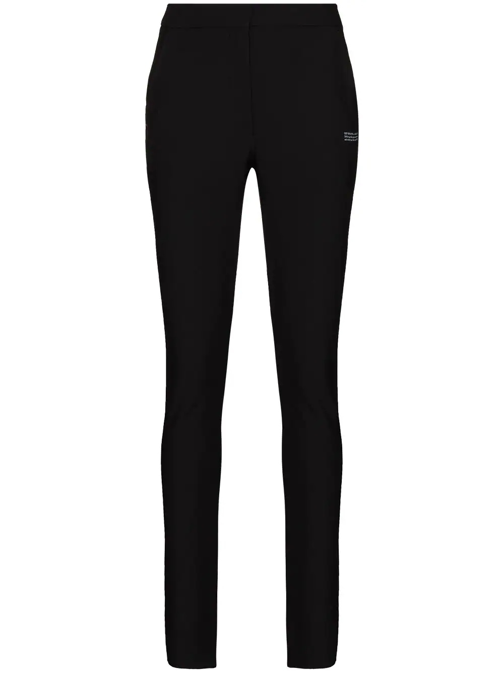 Black virgin-wool blend logo-print slim-fit trousers from OFF-WHITE featuring logo print to the front, logo patch to the rear, slit detailing, mid-rise, concealed front fastening, slim cut, two side slash pockets and two rear welt pockets. Highlights - Black - Virgin-wool blend - Logo print to the front - Logo patch to the rear - Slit detailing - Mid-rise - Concealed front fastening - Slim cut - Two side slash pockets - Two rear welt pockets Made in Italy Composition lining: Polyester 100% outer: Polyester 53%,Virgin Wool 43%,Spandex/Elastane 4%