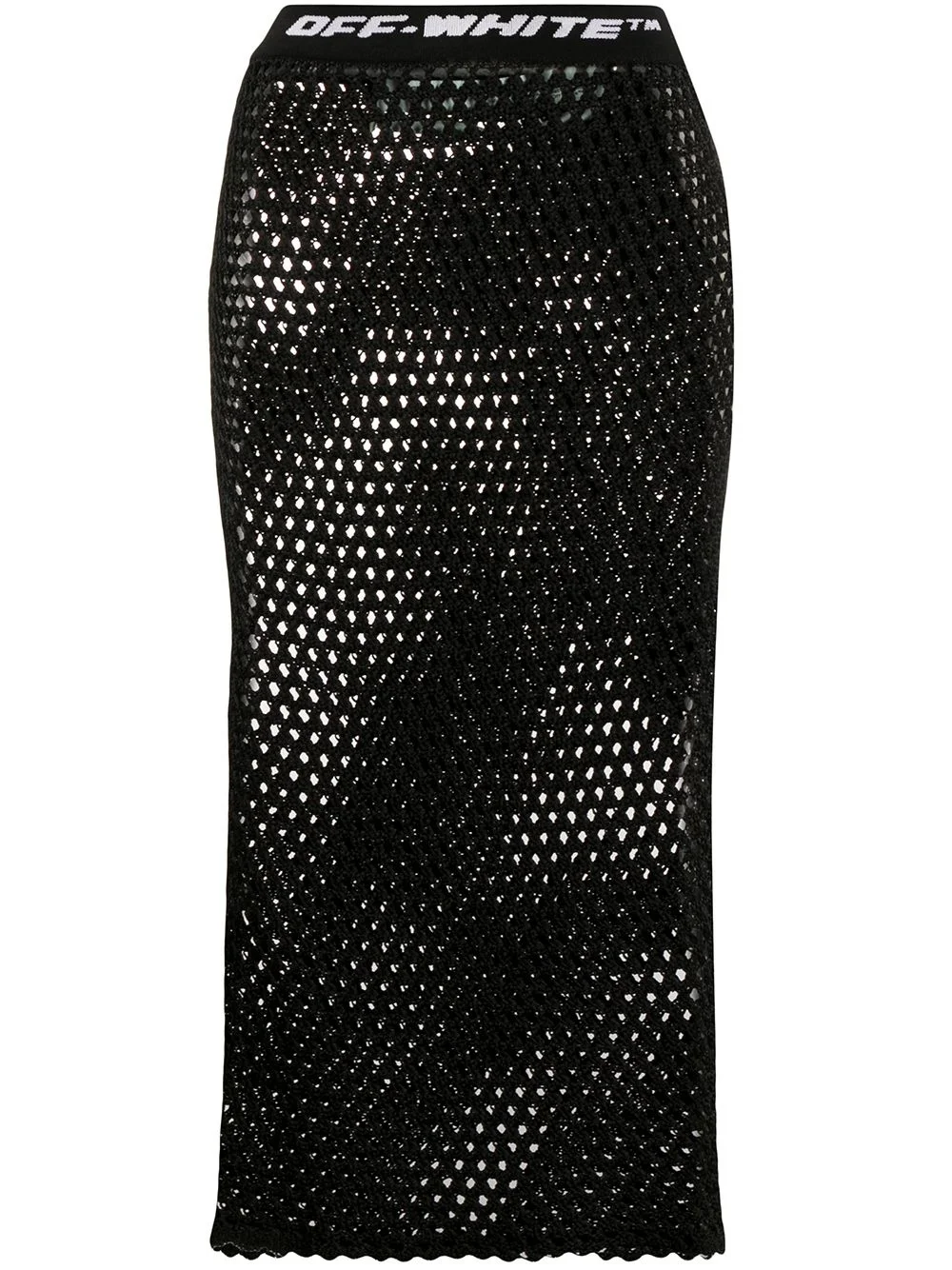 logo waistband fishnet skirt Time to amp up your streetwear game. Detailed with a black and white logo-jacquard waistband, this black skirt in a fishnet style from Off-White is the perfect choice for a bold cool look. Featuring a sheer construction, a mid-length and a scalloped hem. Made in Italy Composition Viscose 90%, Polyester 10% SIZE & FIT Model measurements Height 5 ft 9 in(1.76 m) Bust/Chest 29.92 in(76 cm) Hips 33.46 in(85 cm) Waist 24.01 in(61 cm) FittingInformation This piece fits true to size. We recommend you get your regular size Cut for a slim fit Made with a mid-weight fabric Washing instructions Hand Wash