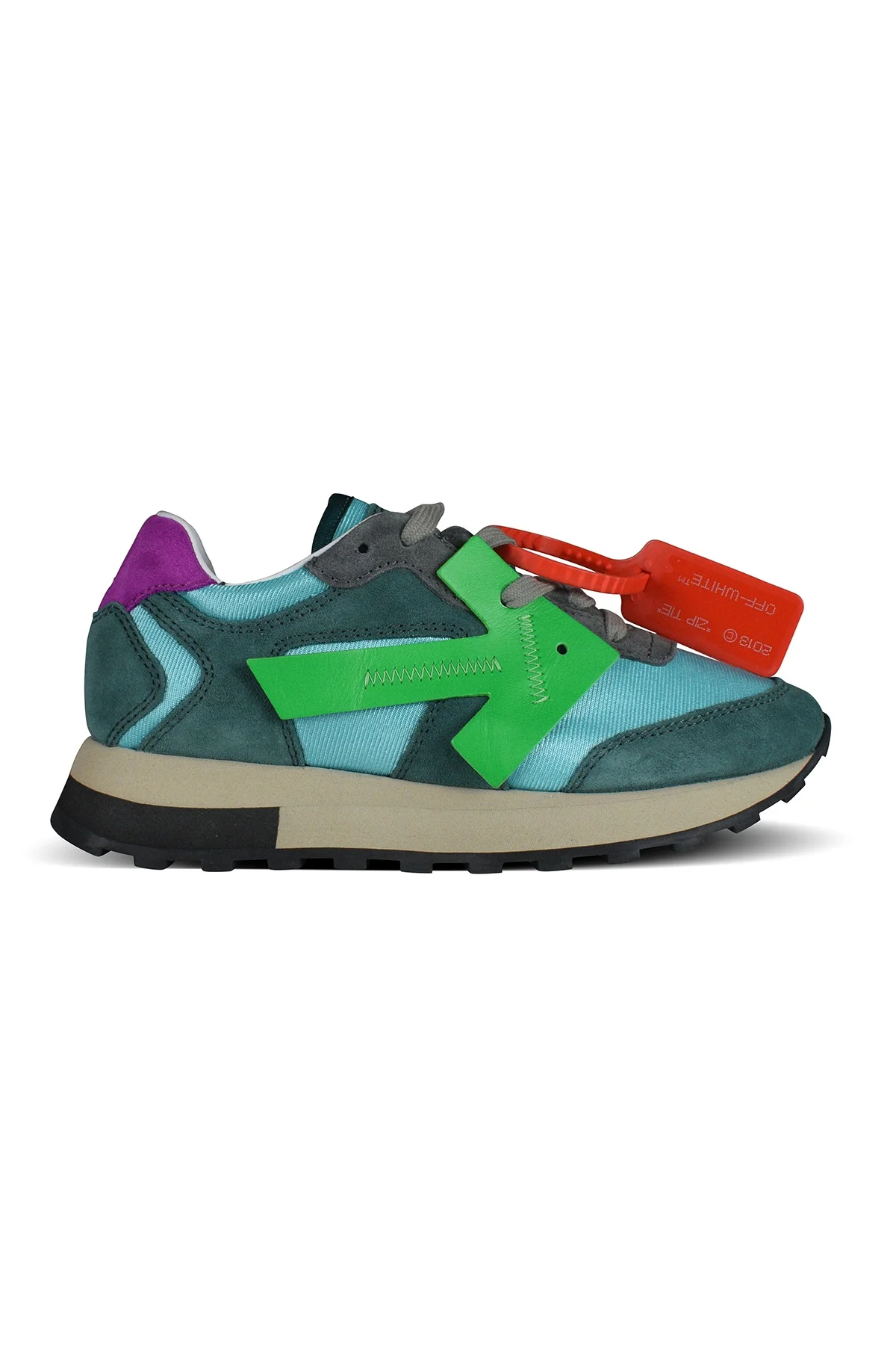 Blue, green and purple HG Runner sneakers from Off-White. Iconic Zip Tie in red. Iconic neon green arrow on the side. Almond toe. Lace-up front closure. Material: leather and fabric. Rubber sole. Made in Italy.