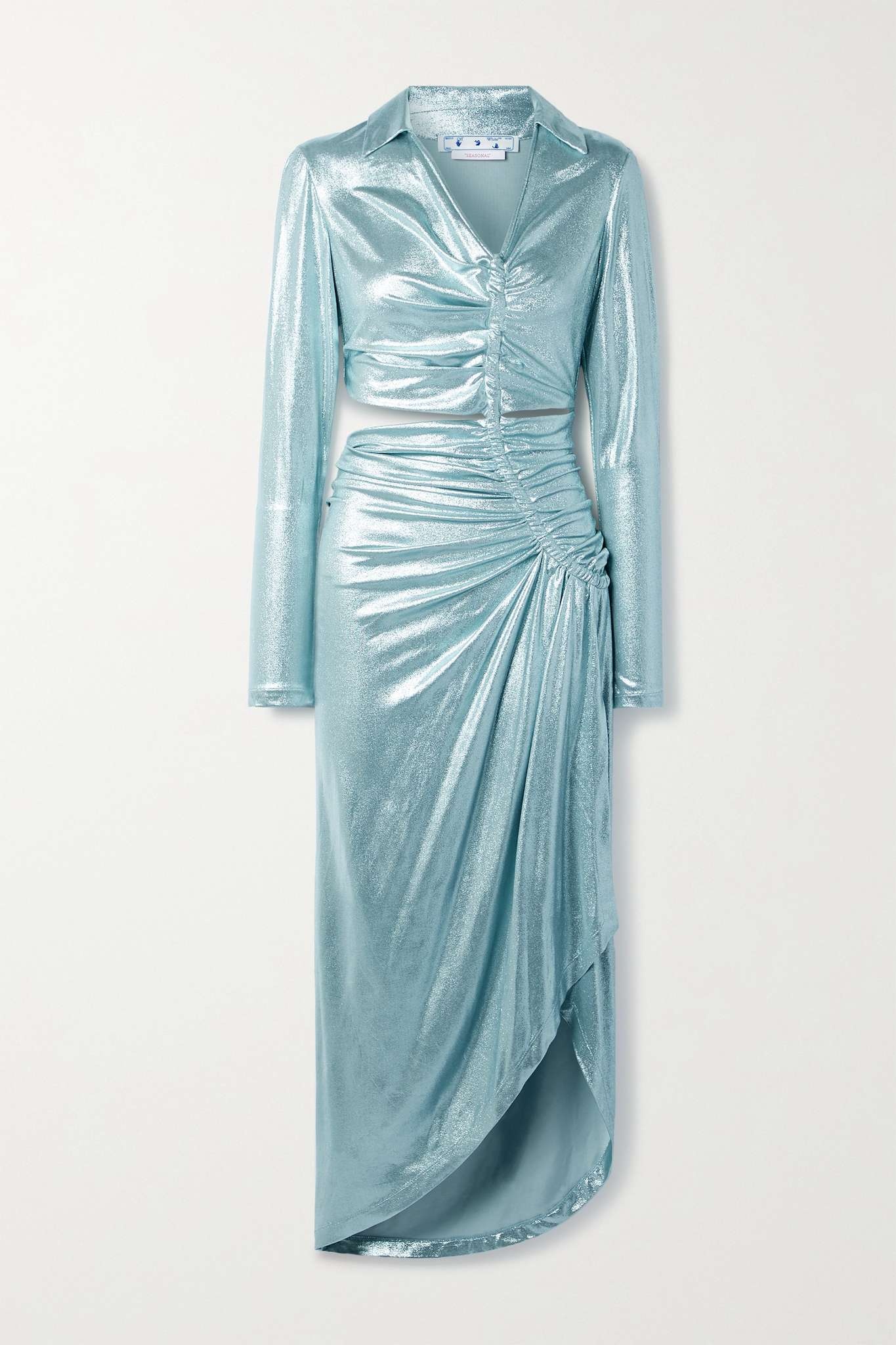 EDITORS'NOTES Off-White's midi dress is cut from glittering silver stretch-lamé with icy-blue undertones. It has a waist cutout that creates the illusion of separates and is ruched for a figure-hugging fit. Style yours with equally sparkly jewelry. SIZE & FIT - Fits true to size, take your normal size - Designed for a slim fit - Mid-weight, stretchy fabric - Model is 175cm/ 5'9" and is wearing an IT 40 DETAILS & CARE - Silver stretch-lamé - Slips on - 97% viscose, 3% elastane - Hand wash